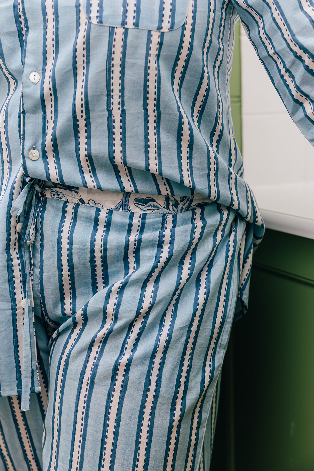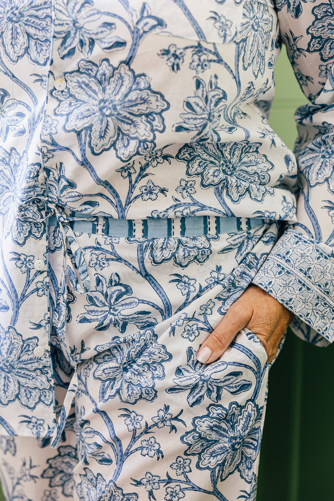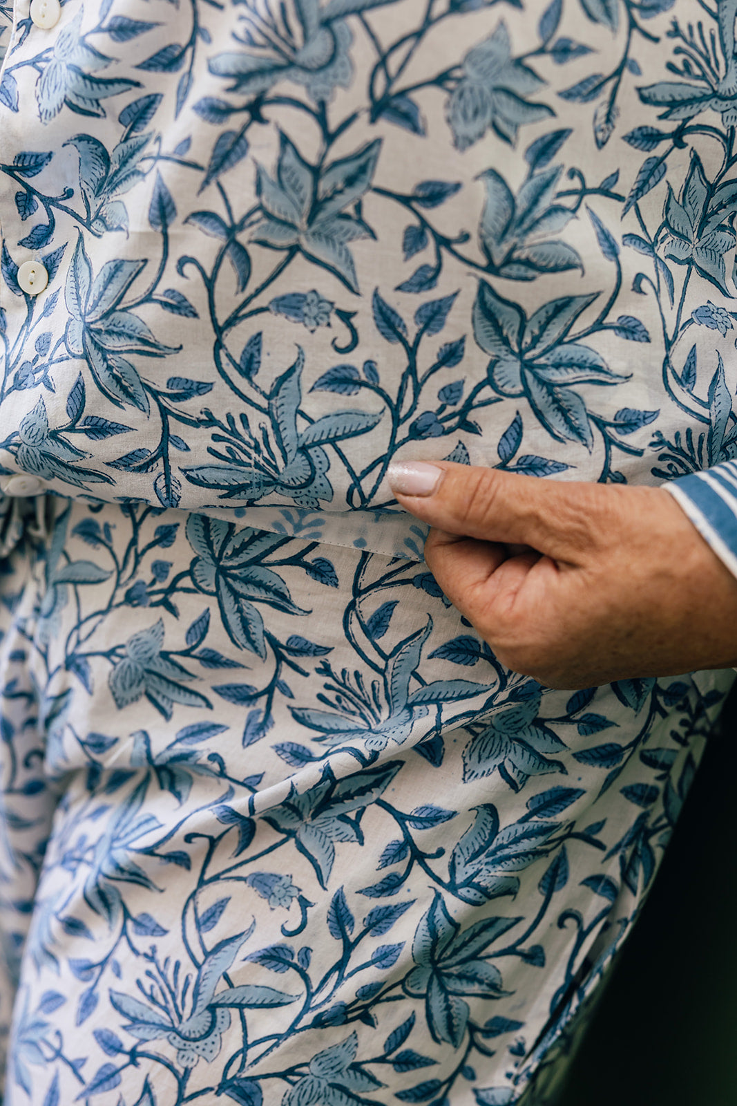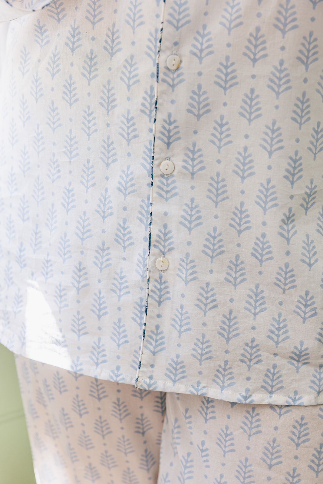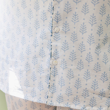 Wrap yourself in comfort and timeless style with this beautifully tailored blue and white pyjama set, crafted in soft, breathable cotton and hand block printed by skilled artisans. Each pattern is stamped by hand, giving the fabric a gentle individuality and a touch of traditional charm.