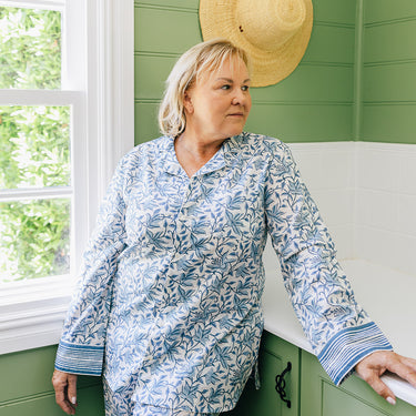 We have two colour ways in these long PJs: blue & white, or multicolour ( coming soon). Our collection also includes shorty pyjamas, nighties and kimonos (click on links here!)