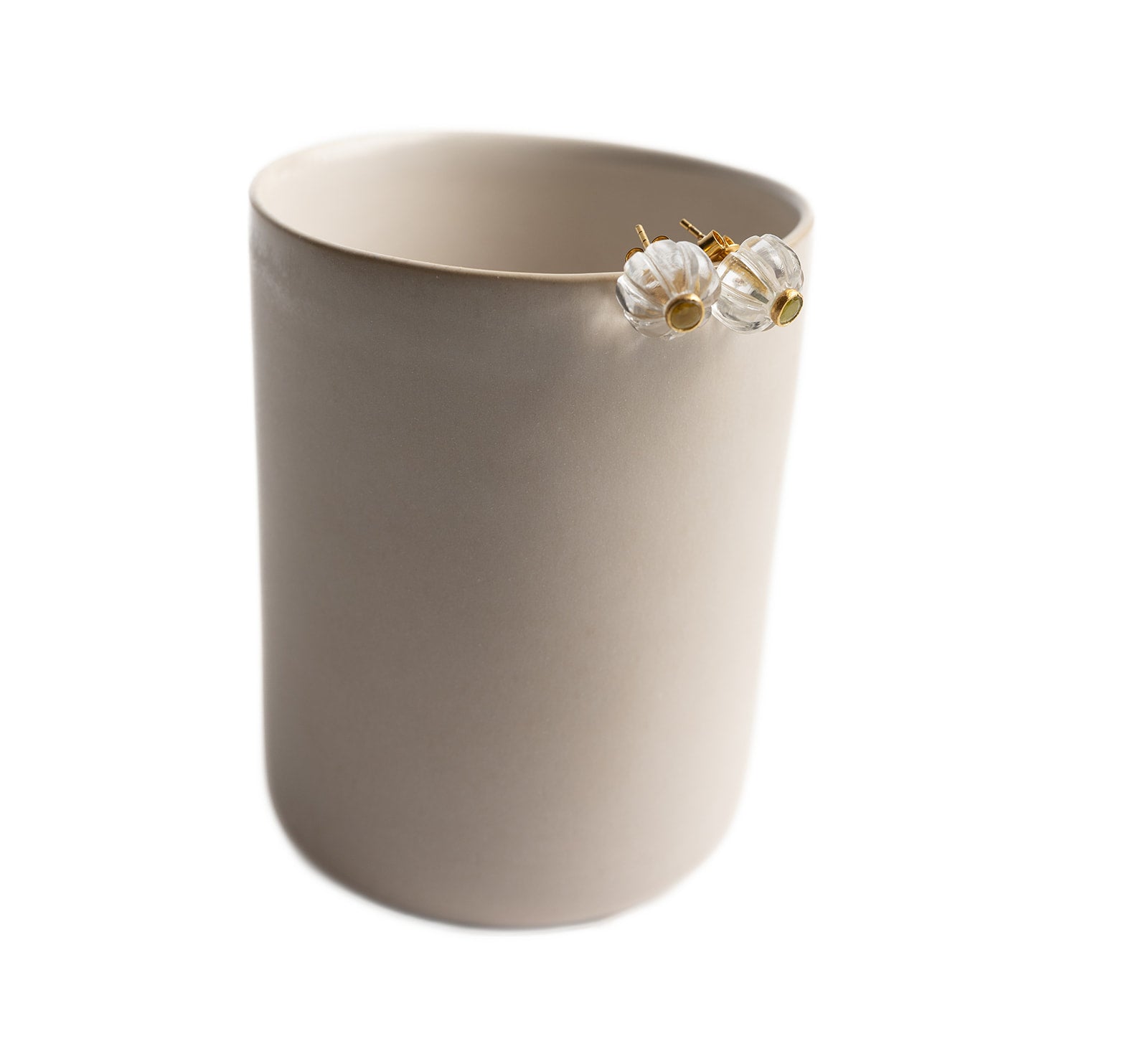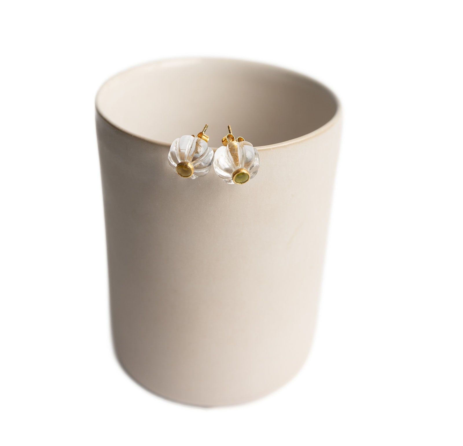 Merchant Campbell earrings, carved crystal quartz earrings, tourmaline earrings, gold-plated silver earrings, Jaipur handmade jewellery, natural stone earrings, carved gemstone earrings, quartz flower earrings, green tourmaline jewellery, artisan earrings India, fine jewellery Jaipur, classic gemstone studs