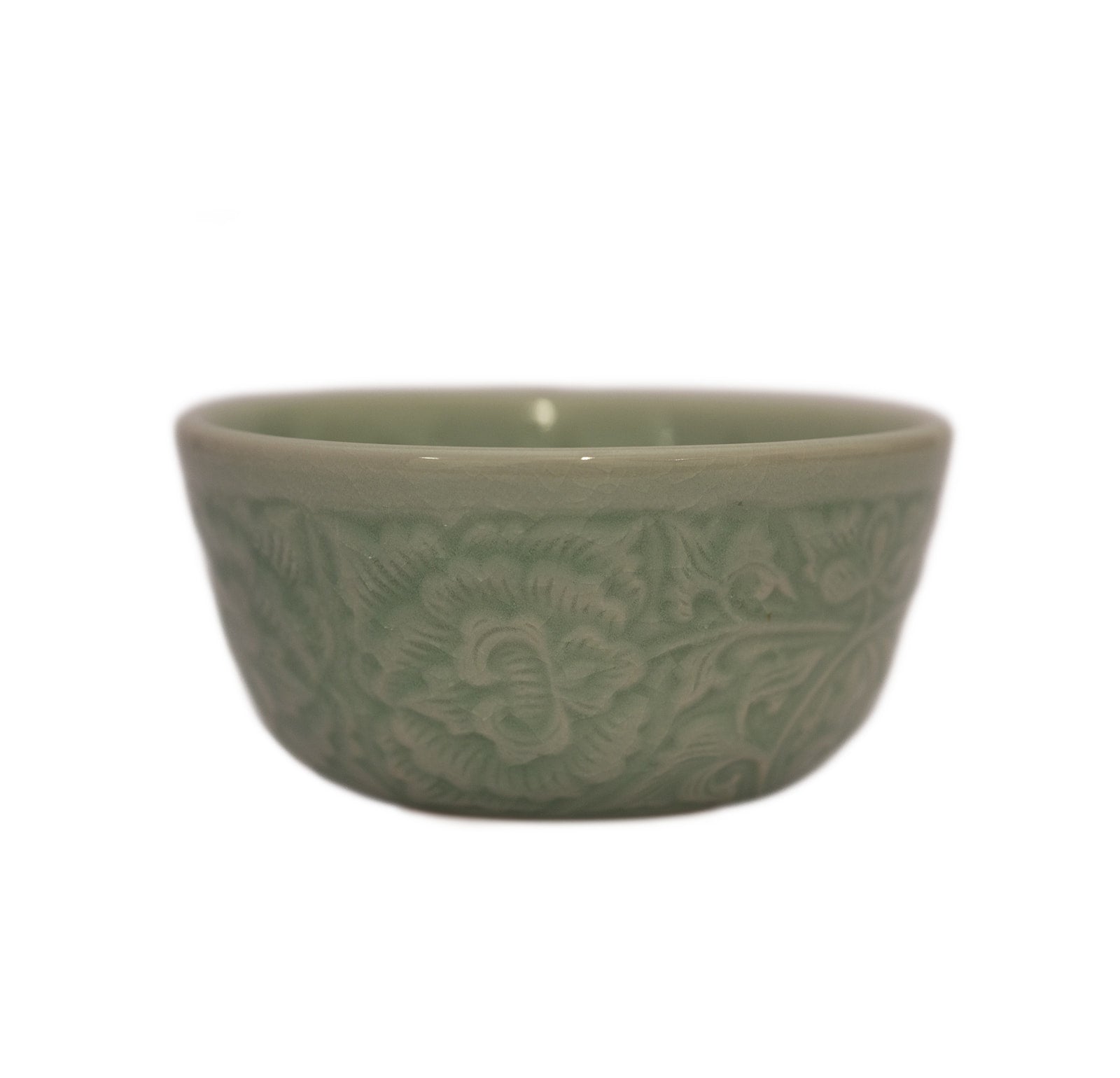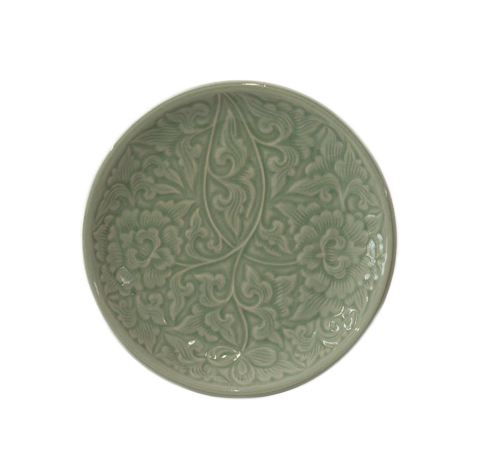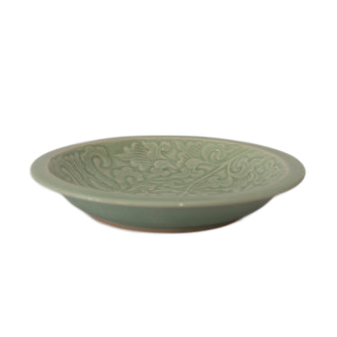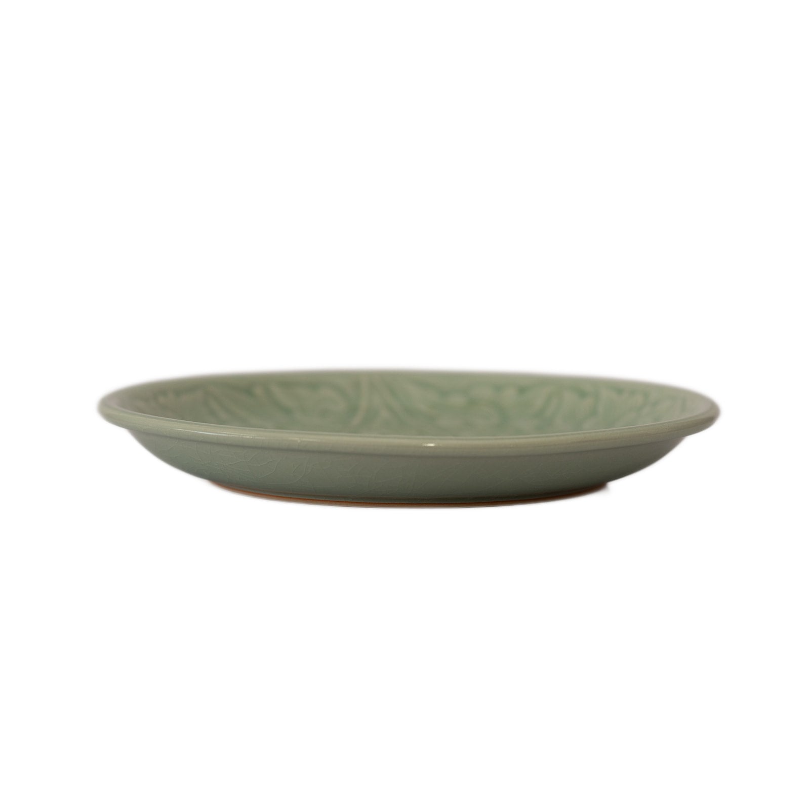 Crafted by skilled artisans in Thailand, this embossed dinnerware and serving collection is finished with a traditional celadon wood ash glaze, celebrated for its luminous depth and subtle variations in tone. Each piece is hand-thrown and kiln-fired, resulting in unique crackle patterns and soft, translucent hues that make every item one of a kind.