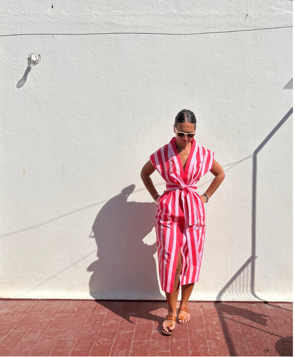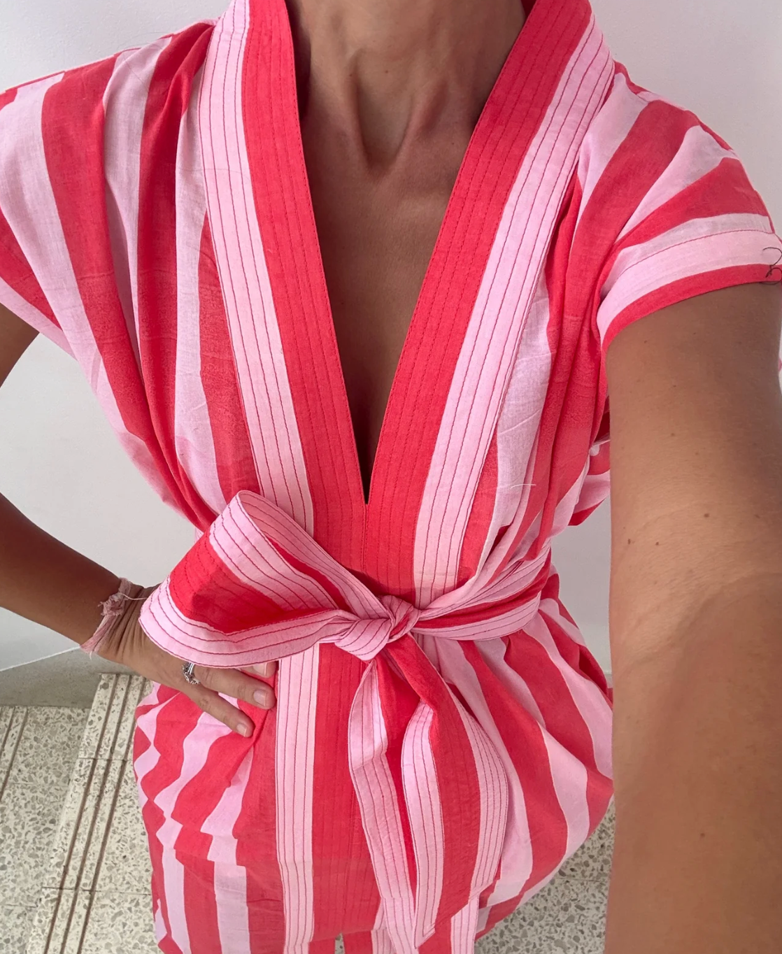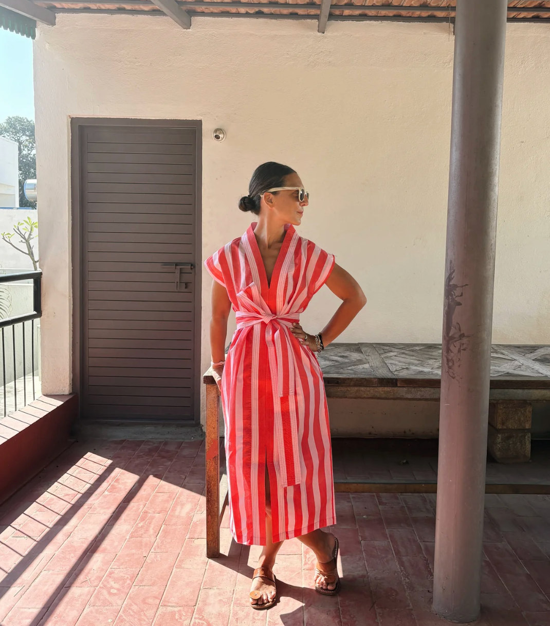 In Briony, from Bundu Textile's words:Pink and Red Wide Stripe Block Print 01 Cotton Kaftan