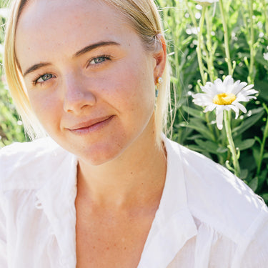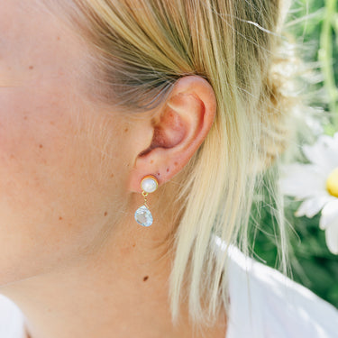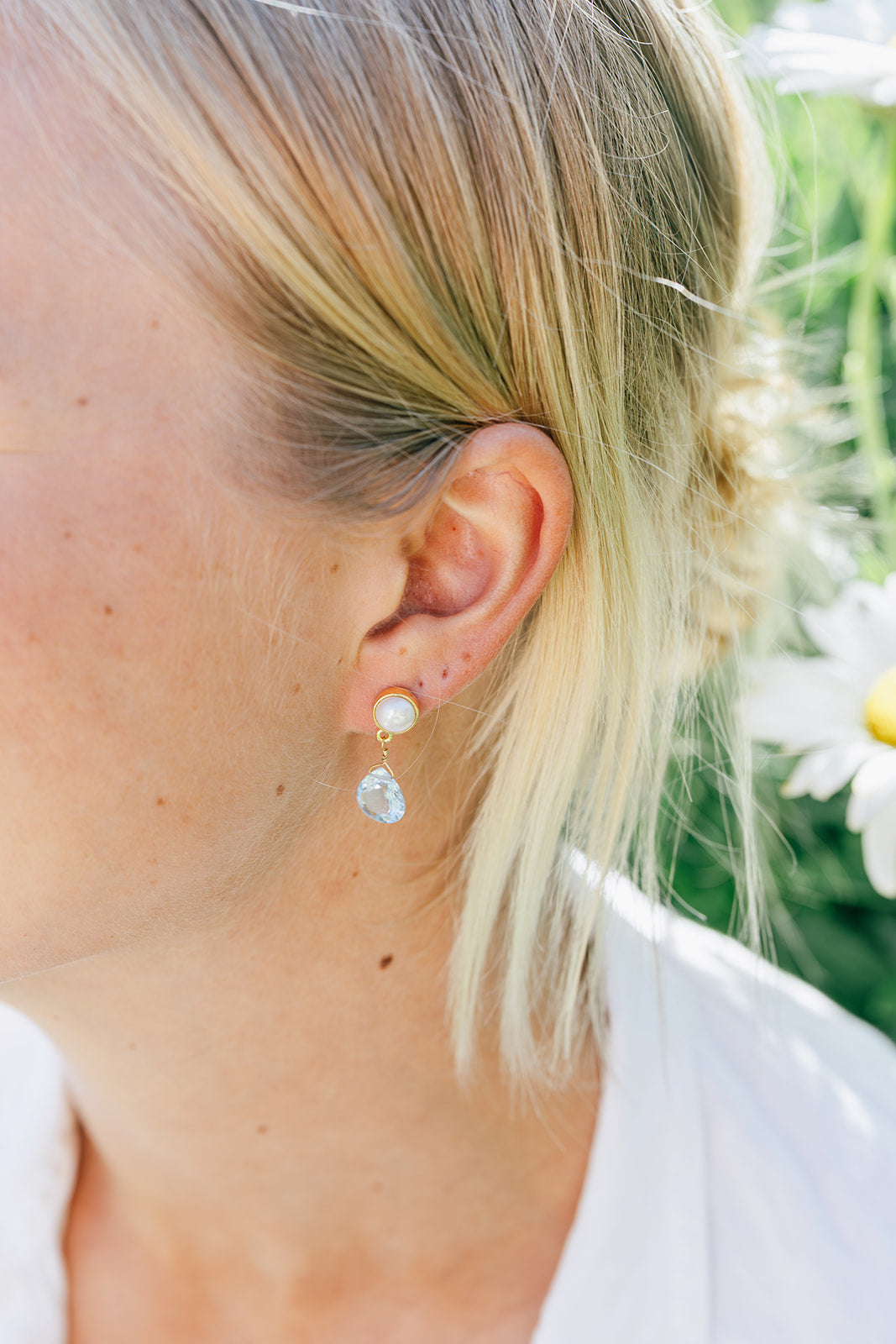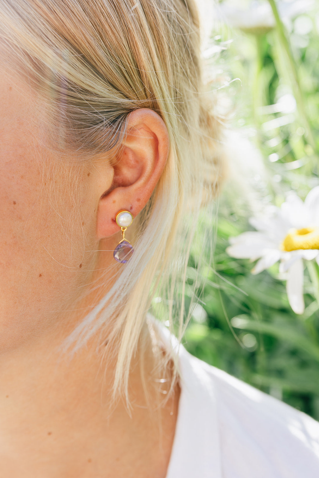 Handcrafted in Jaipur, India, these bezel-set pearl stud earrings are finished with a delicate drop of facetted semi-precious stone, creating a refined balance of classic and contemporary design. The luminous pearl sits neatly at the ear, while the natural stone drop adds soft colour and gentle movement.