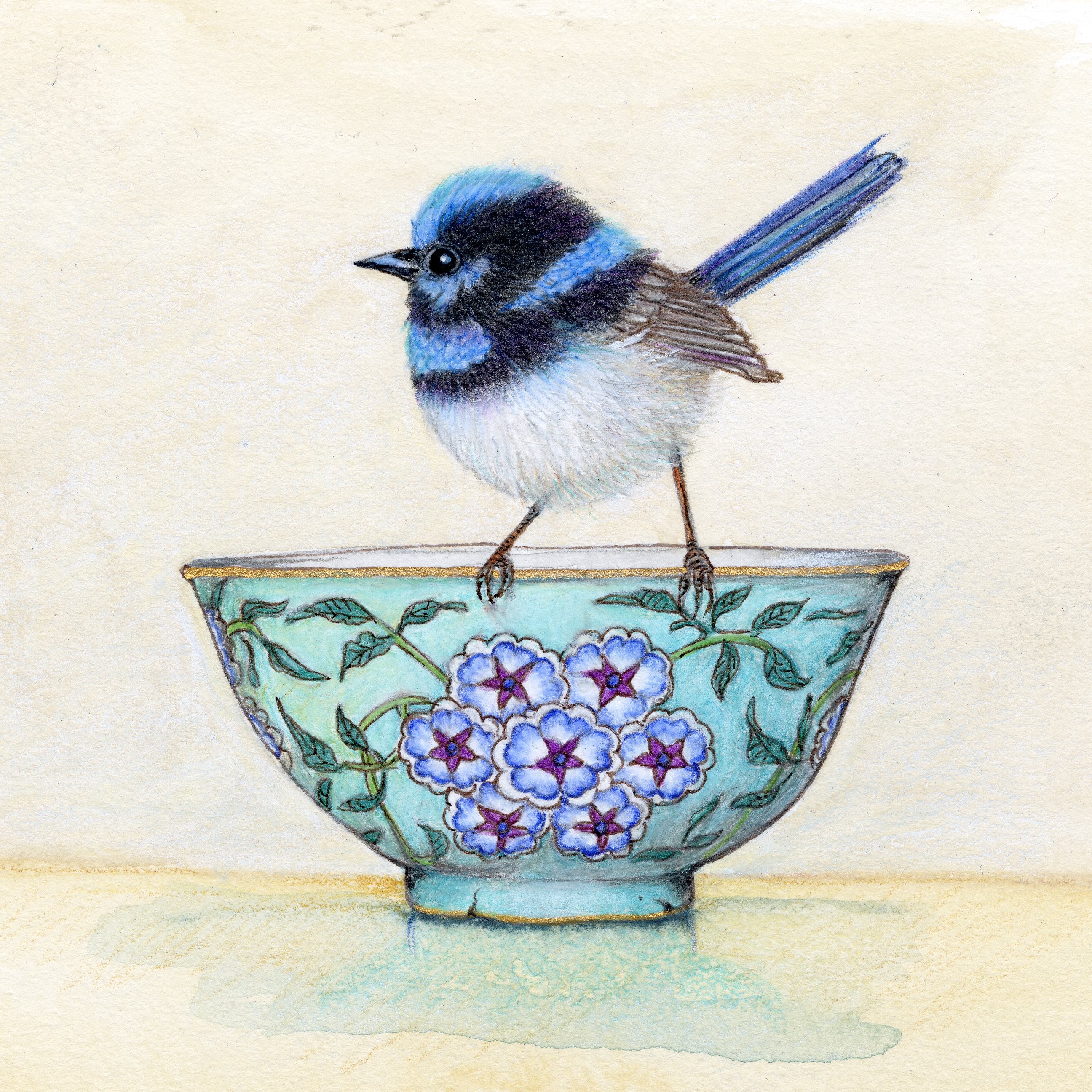 In her current work, she has turned her attention to combining beautiful antique objects with the enchanting birds who visit her garden and surrounding land. These works are called ‘The Loved Objects’ Collection. She continues to be inspired and delighted by objects in her home, objects she sees in her travels and those she sees at auction houses. In her imagination, the beautiful objects are visited throughout the year by many and varied bird species. She creates magical still life arrangements by combining the things she loves – with the creatures she loves.