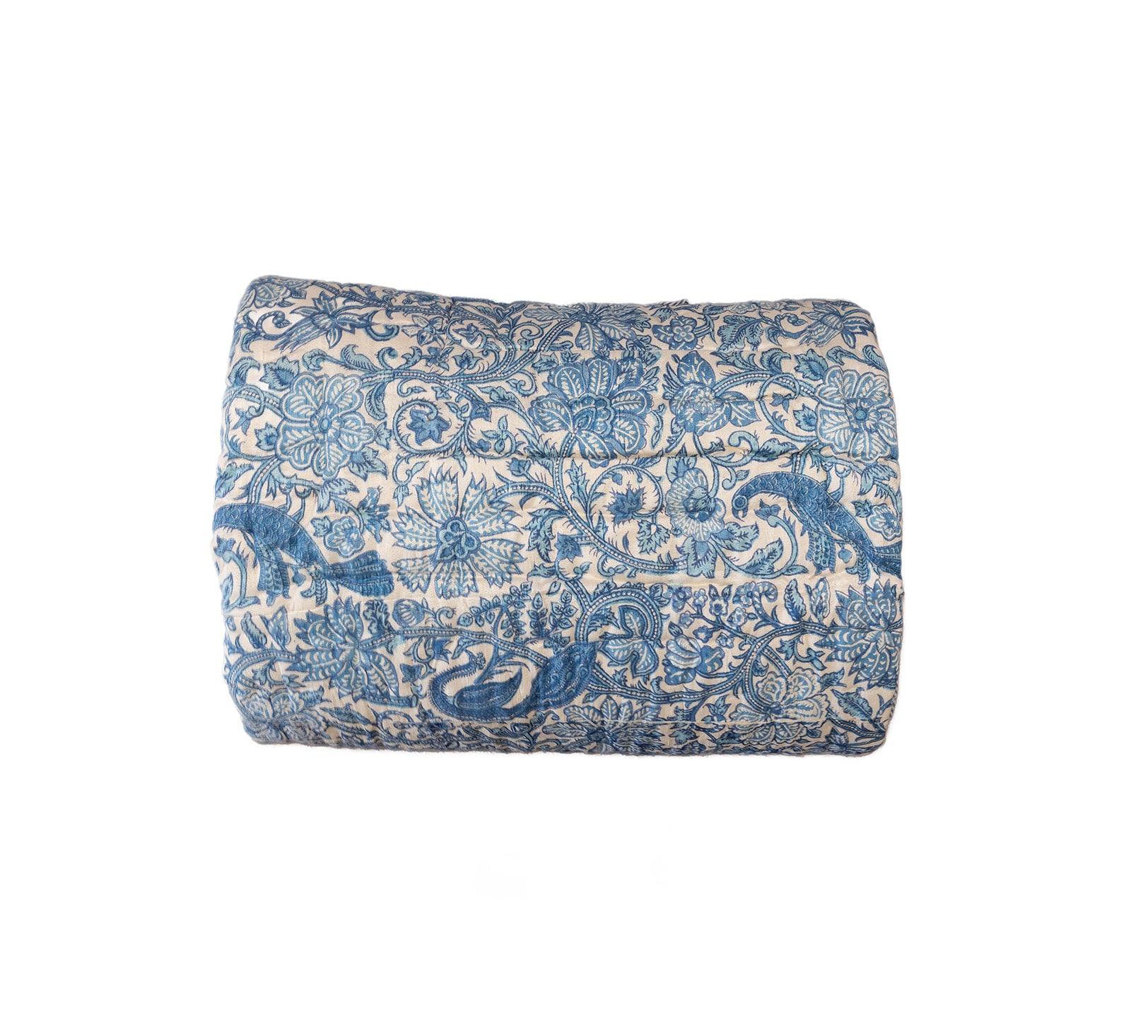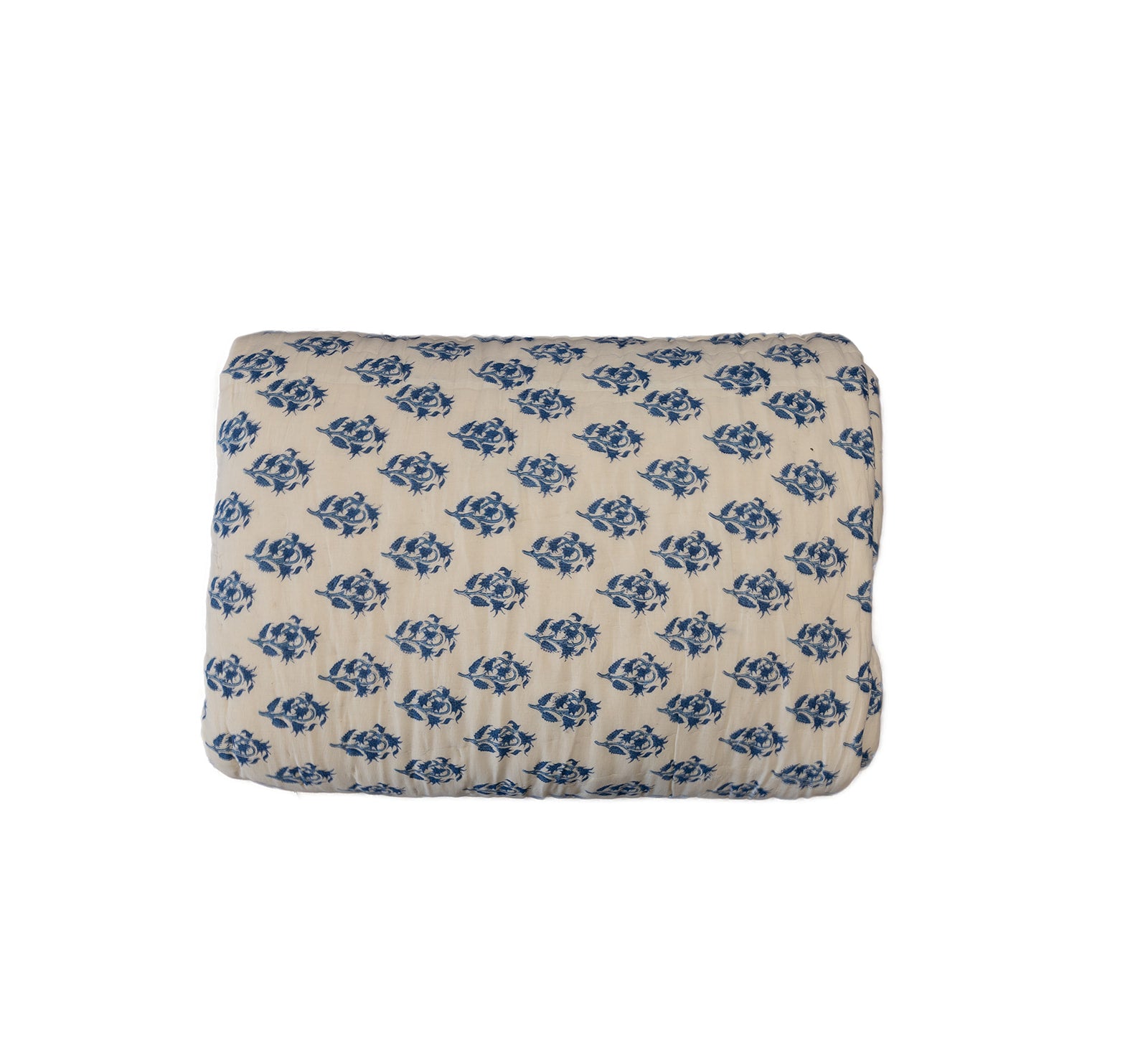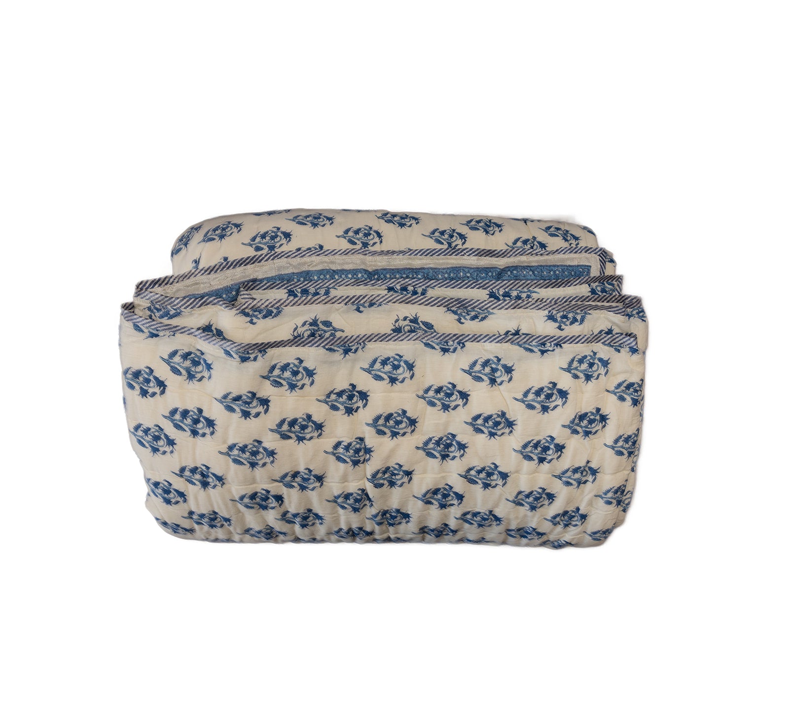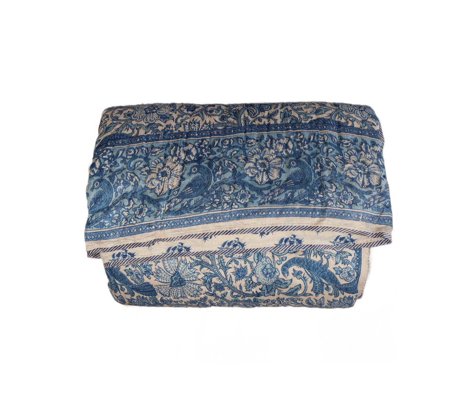 This quilt is crafted from soft silk, hand block printed using traditional wooden blocks to create intricate patterns with a timeless charm. A truly special piece, it's light yet warm, and is filled with natural cotton for breathable comfort, making it perfect for layering year-round. Each piece is handmade by skilled artisans, celebrating the slow art of block printing where no two quilts are ever exactly alike.