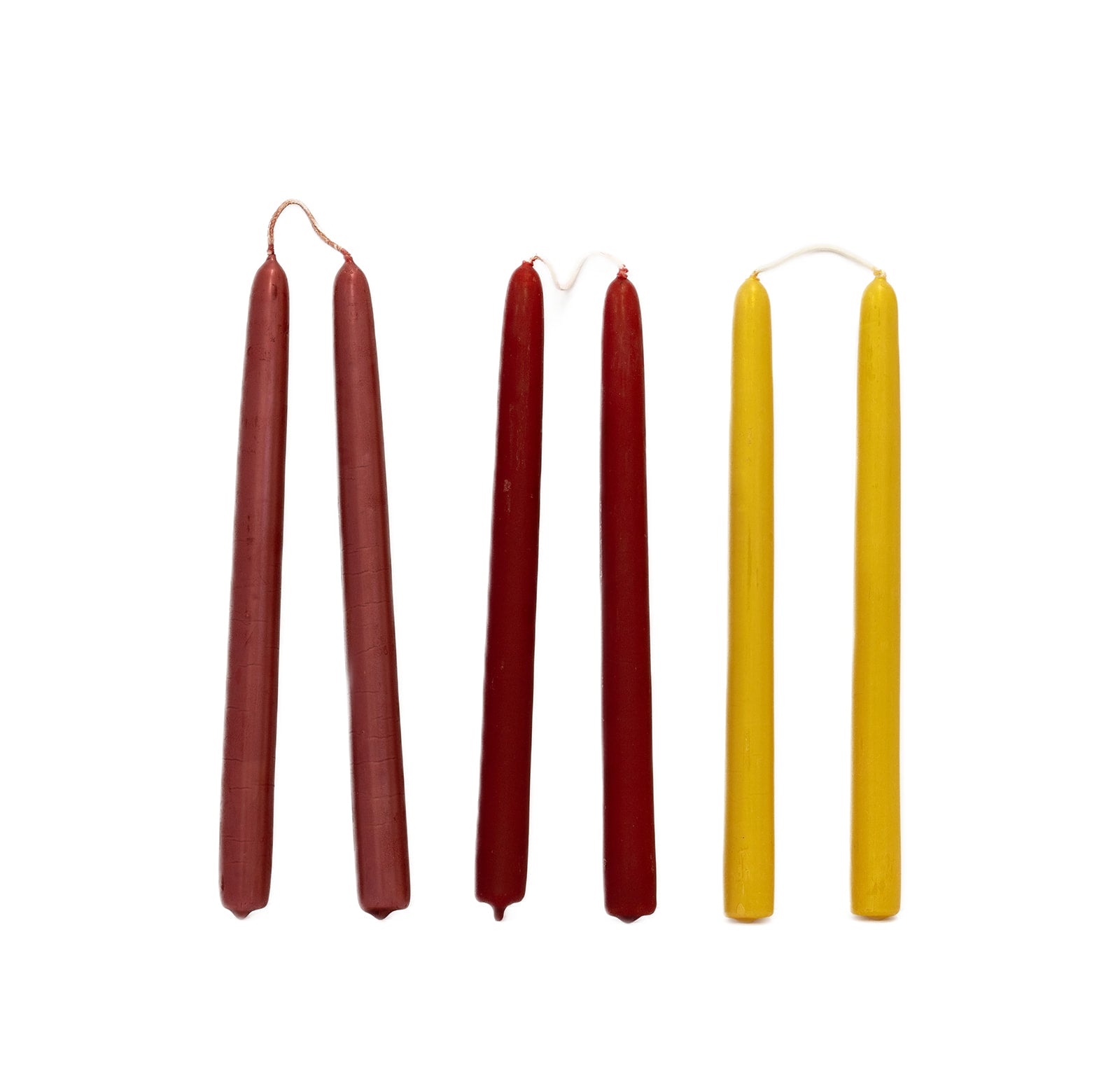 Our natural, handmade beeswax hand-coloured dinner candles are the finishing touch for your Christmas table.  Perfect for your candlesticks or candelabra, on the table, mantelpiece or anywhere for that matter!