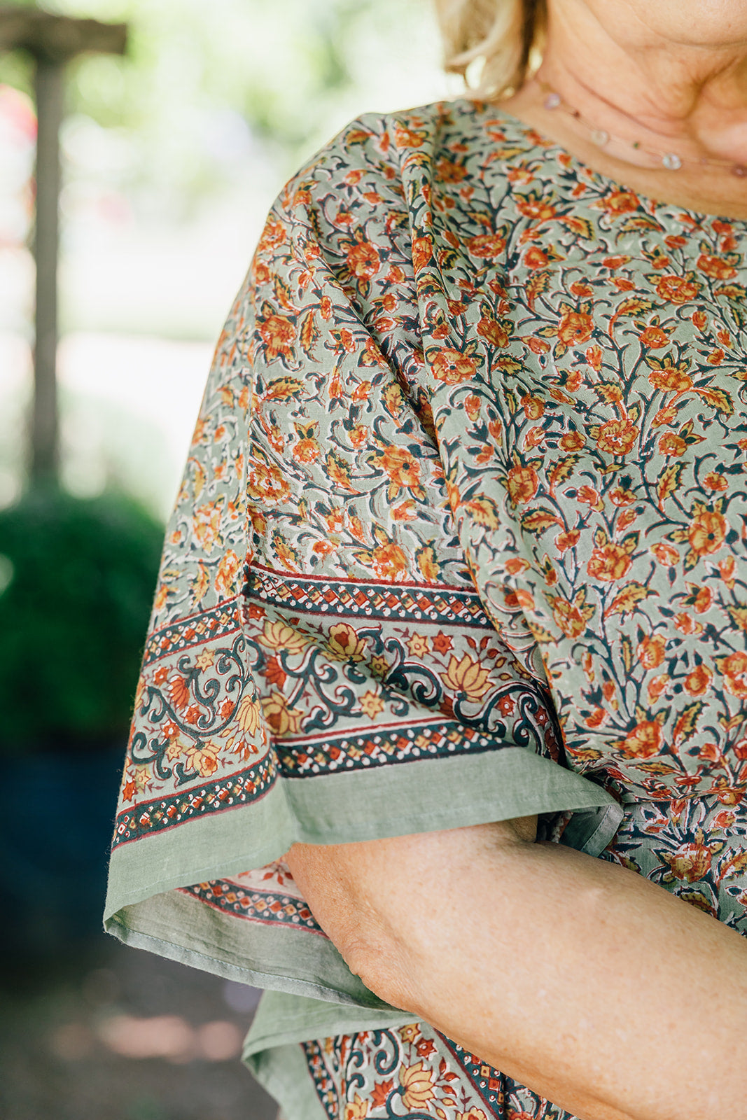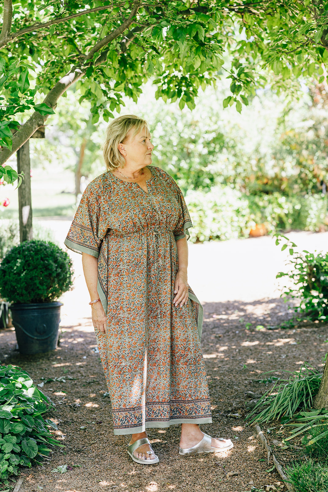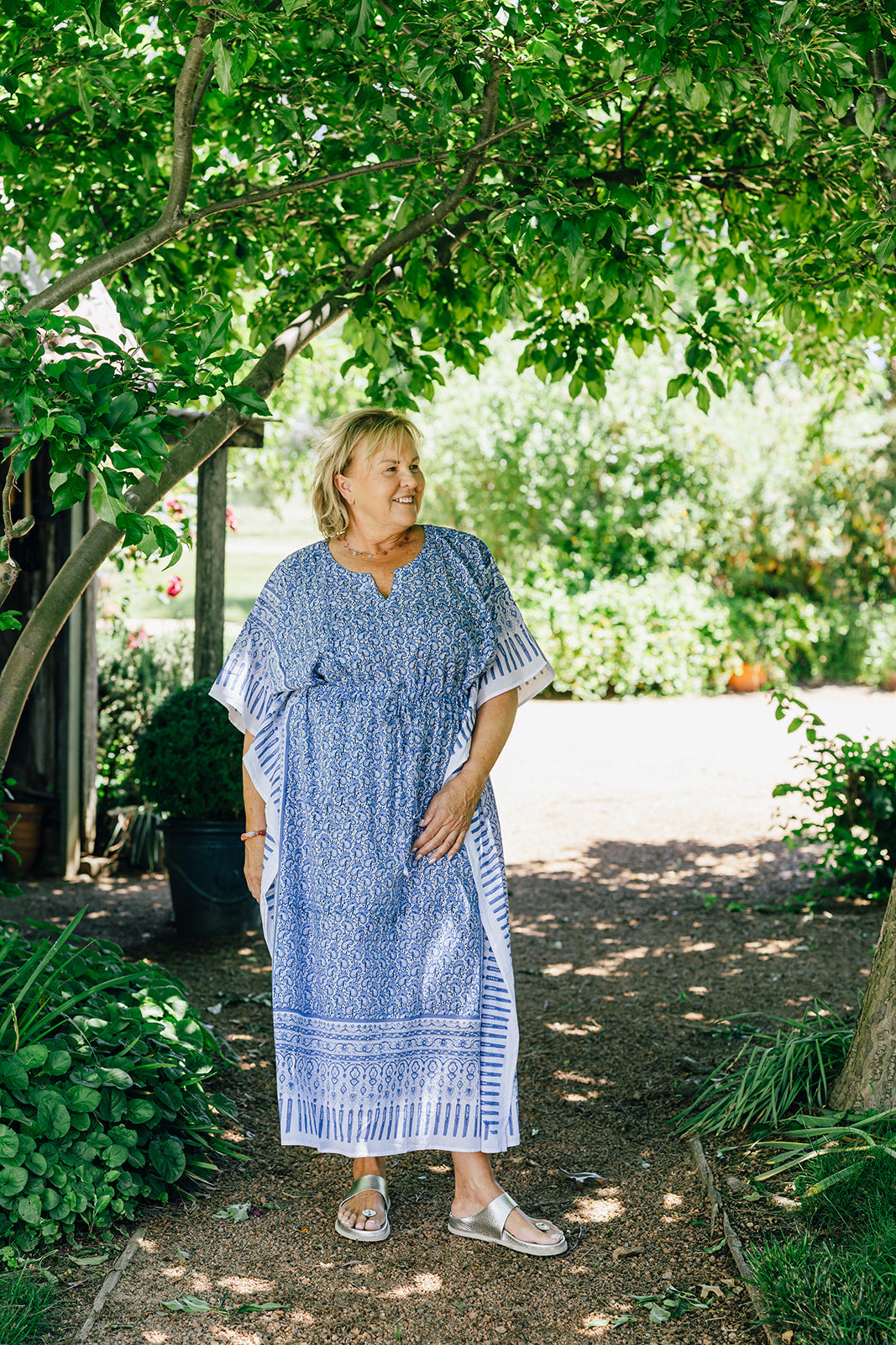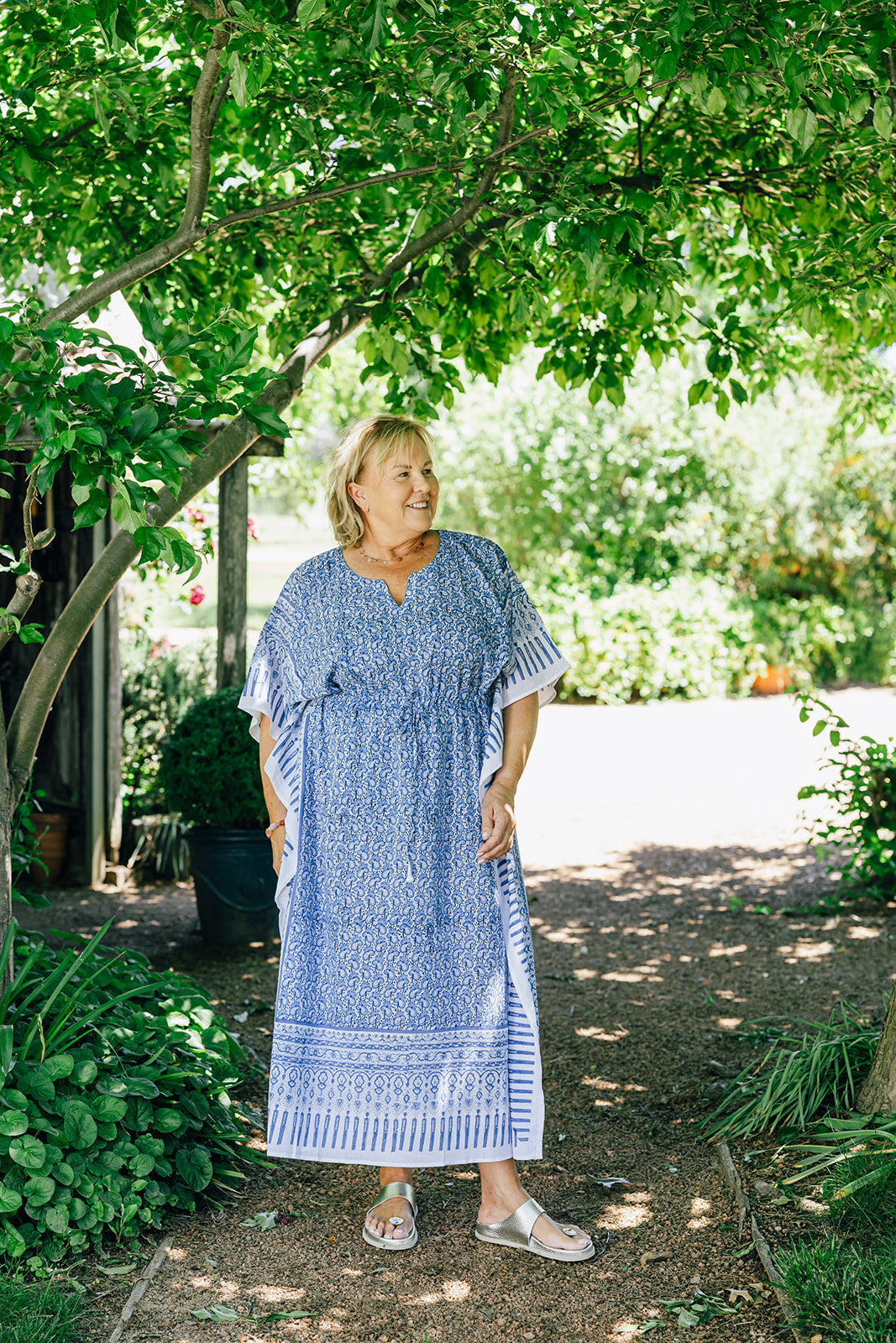 Our kaftans are carefully and ethically block printed and made by Anokhi, the great Indian textile business which was created to preserve traditional Indian handicrafts. Anokhi has won many awards from the Indian government for its careful environmental practises and for its staff-friendly, ethical workplace.