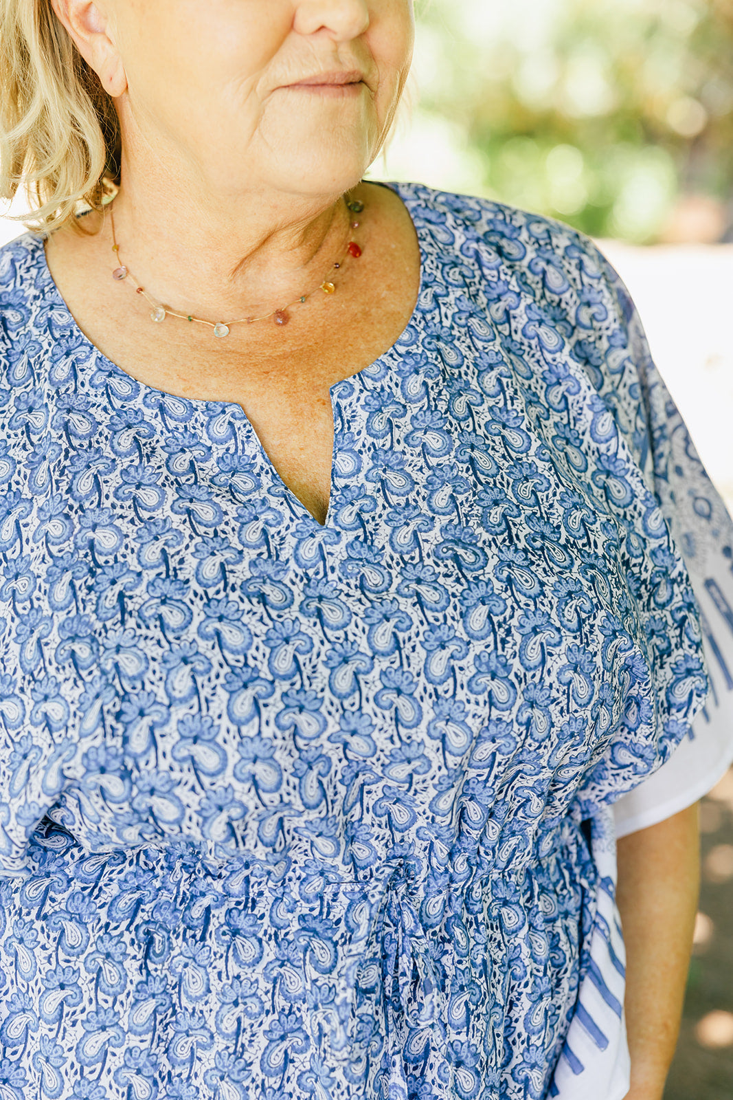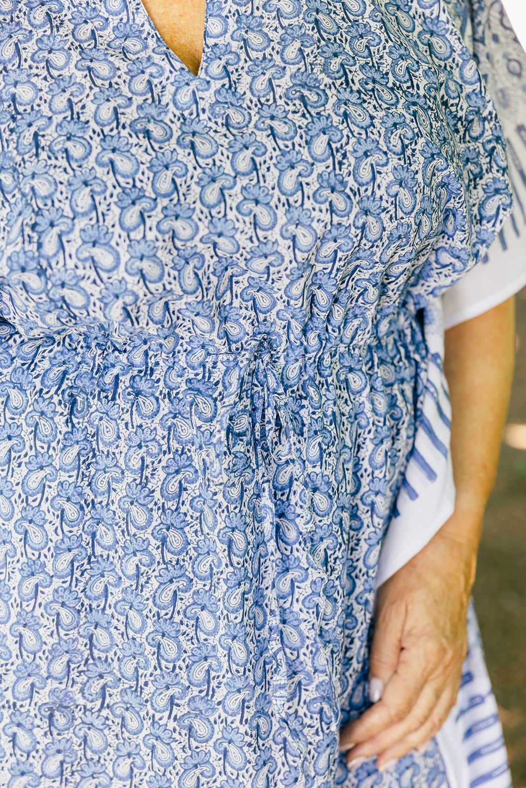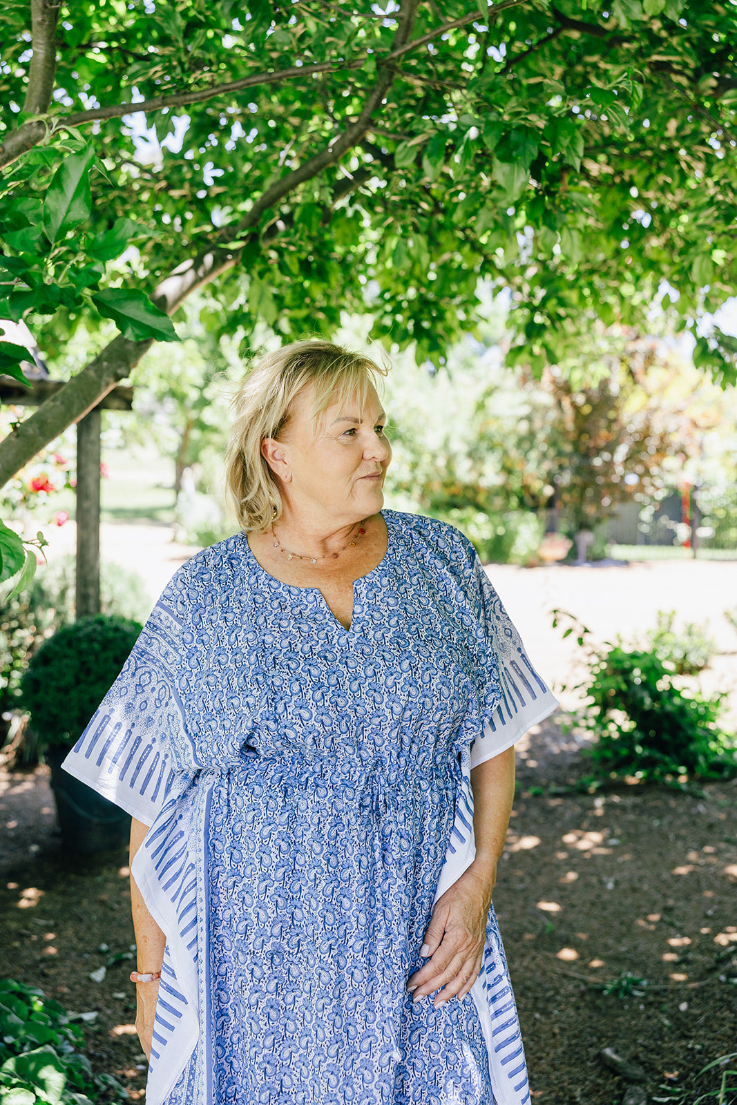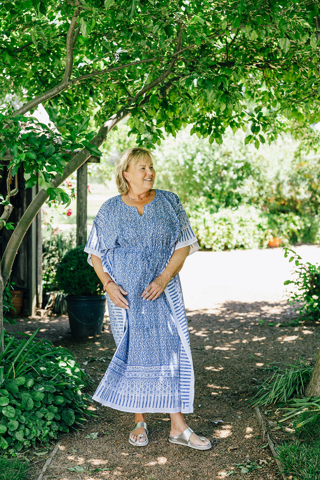 Our kaftans are carefully and ethically block printed and made by Anokhi, the great Indian textile business which was created to preserve traditional Indian handicrafts. Anokhi has won many awards from the Indian government for its careful environmental practises and for its staff-friendly, ethical workplace.