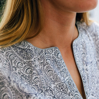 Beautiful, soft 100% cotton with mid length sleeves, all hand block printed and made by the famous Anokhi in Jaipur, India.
