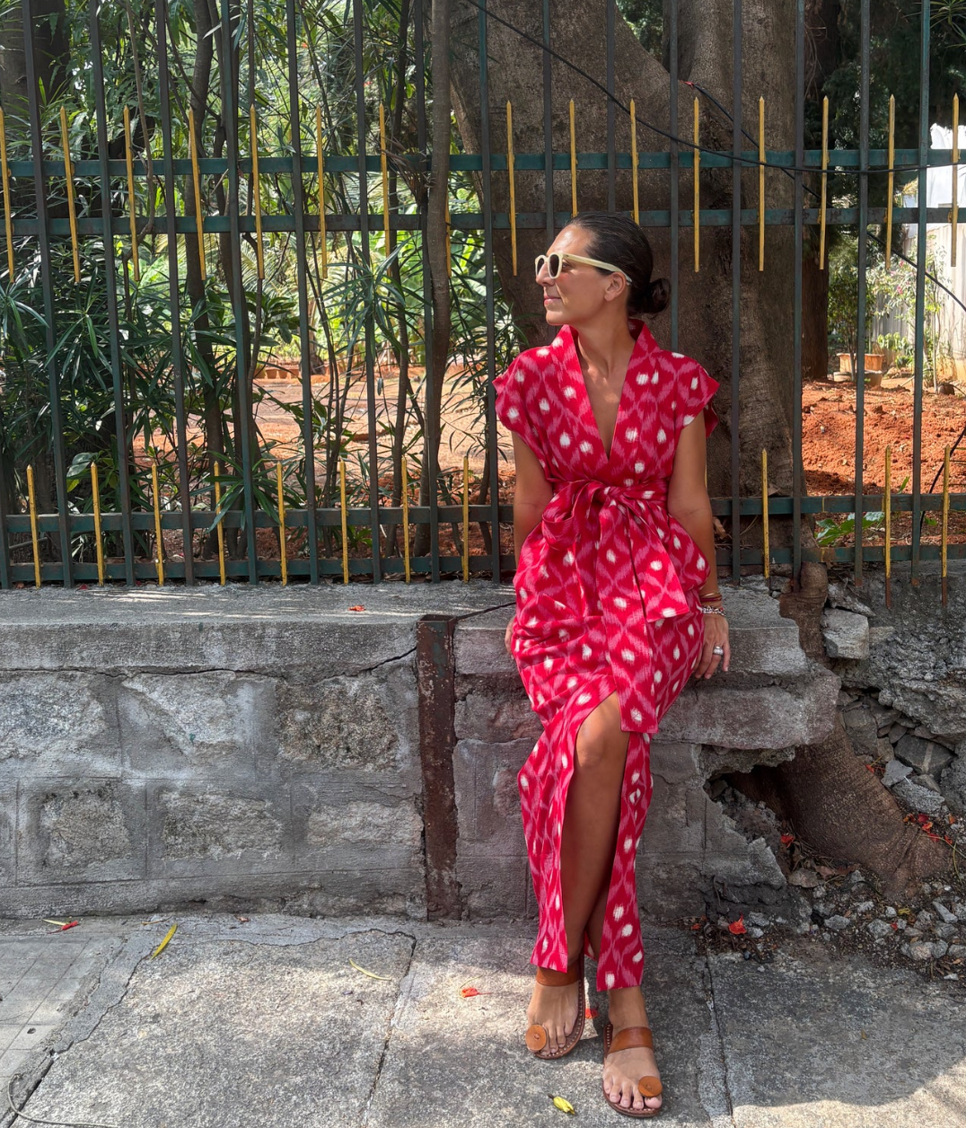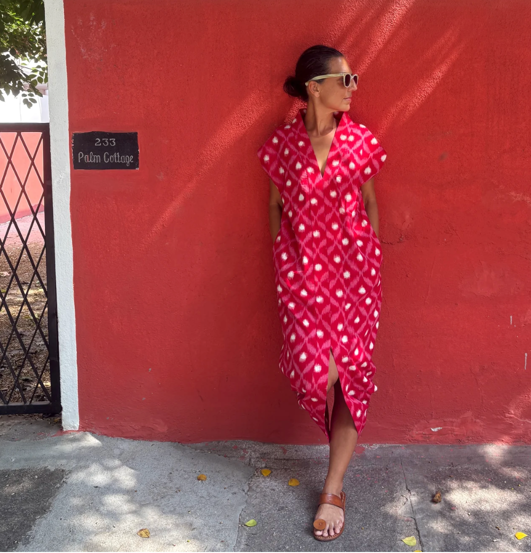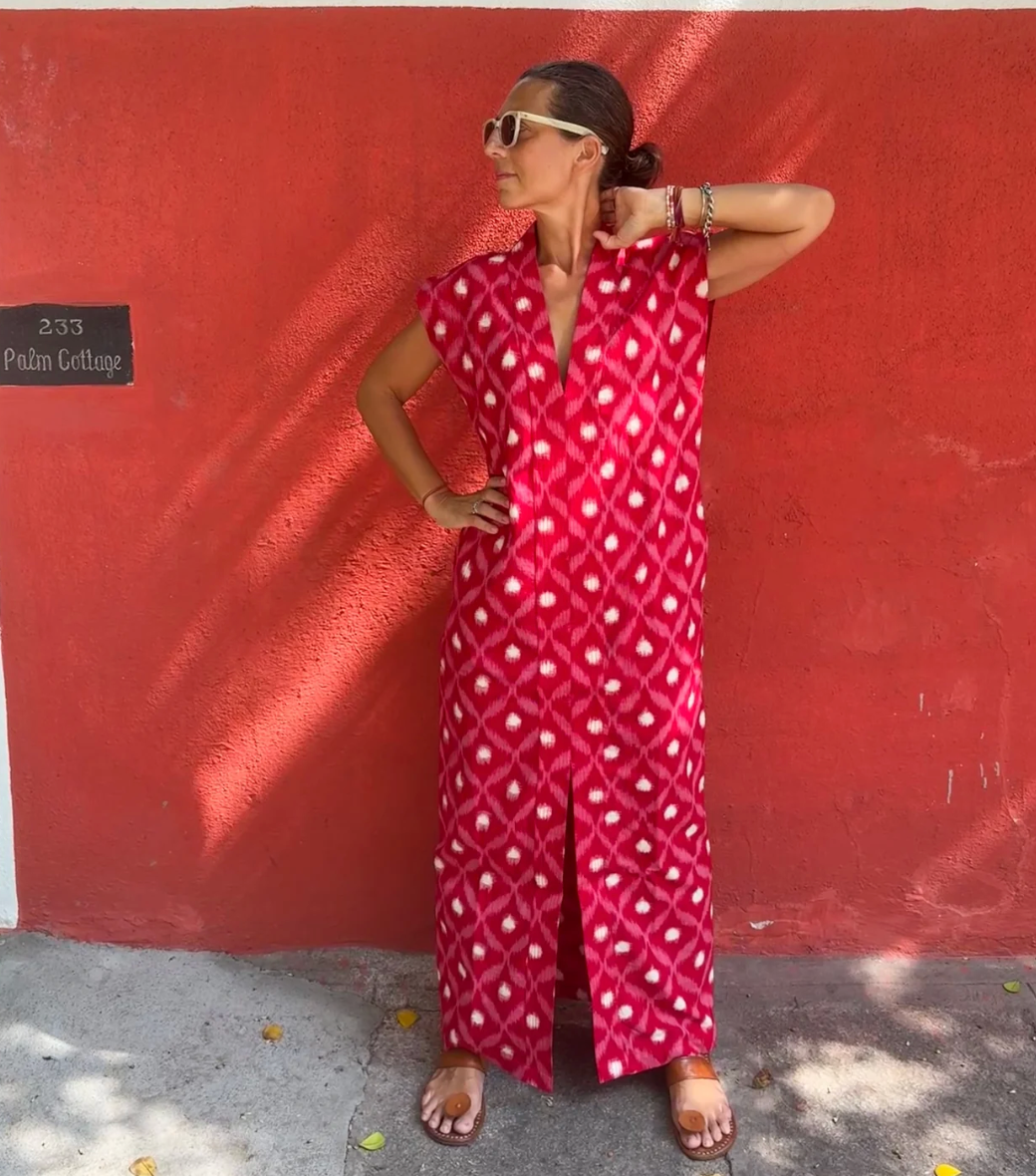Pink, Red & White Ikat 053 Cotton Kaftan