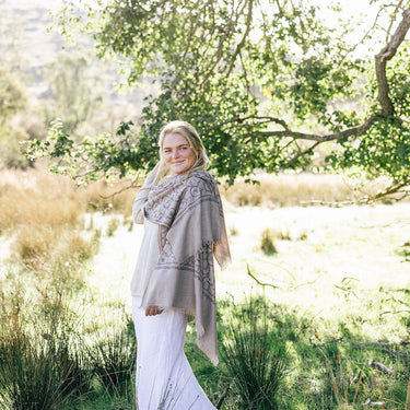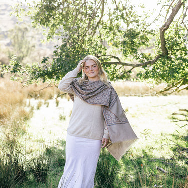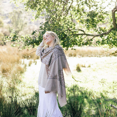 But not only is the embroidery done completely by hand, the weaving is also done by hand.  The craft of shawl-weaving came to Kashmir seven centuries ago from eastern Persia and central Asia.  No machinery or electricity was used to make this wrap - and even the cashmere goats themselves were carefully and lovingly hand-shorn.  Made from the rarest and finest undyed cashmere, grown in the Kashmir Valley, using weaving techniques and arts from the 15th century Persia, a shawl like this is like no other.  It is the definition of wearing something pure and magical.  And just like the techniques used the make this shawl have been passed down through the generations, the shawl itself will also be something to pass down, from one generation to the next.