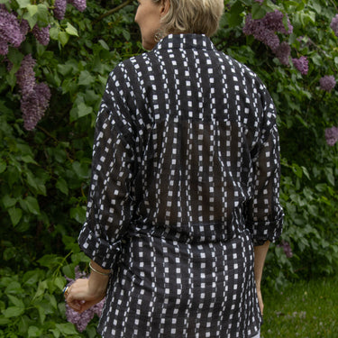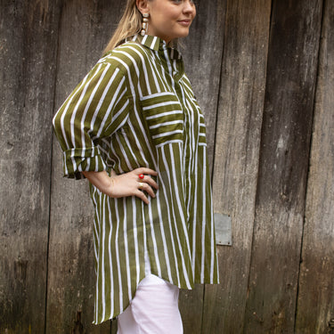 We just love this shirt so much that we had to get it made in as many colour ways as we could fit in the container! We think you're going to love it, too - it's lightweight (perfect for summer), is nice and long (makes a fantastic cover up over swimmers), and drapes beautifully. Whether you choose to wear it as is, French tuck or tie the front, a fashion fail is impossible in our one-size-fits-all Sofie Shirt.