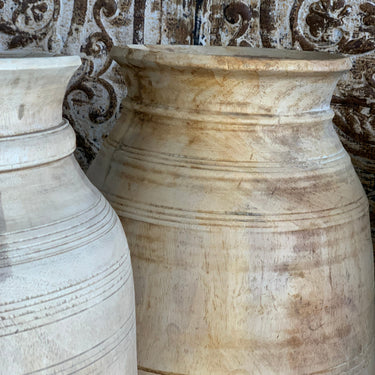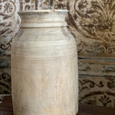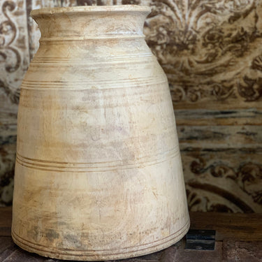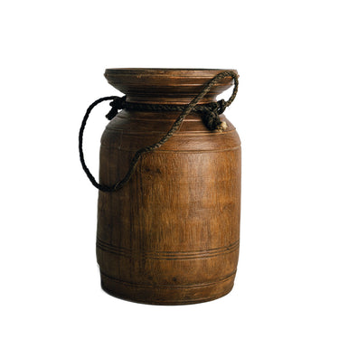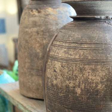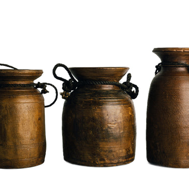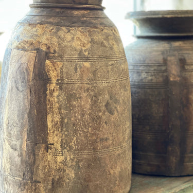 Traditional hand carved vintage wooden pots from Nepal, these lovely pieces were previously used to store food, ghee and milk. Some of these pots have been repaired over the years and each has its own patina.