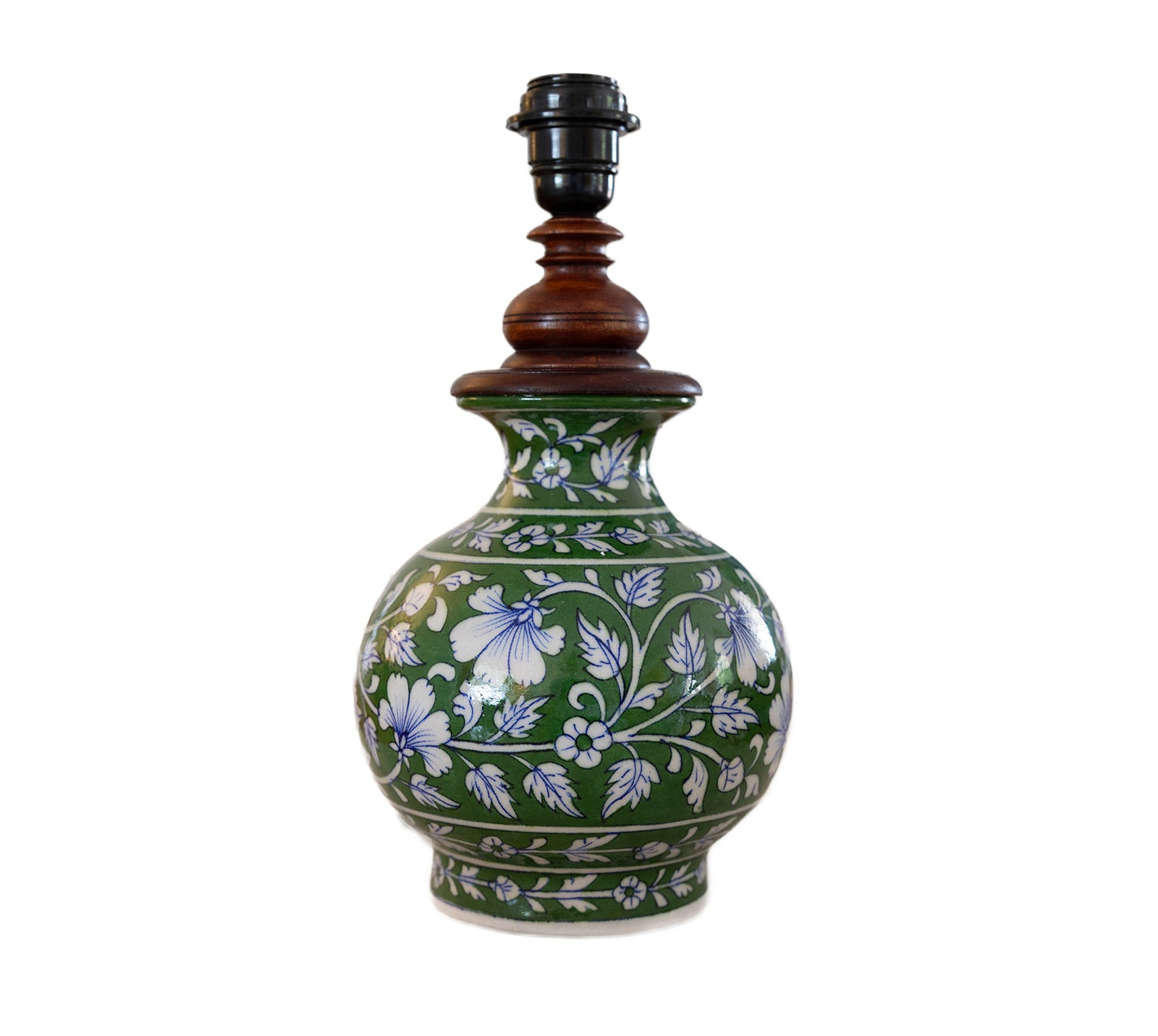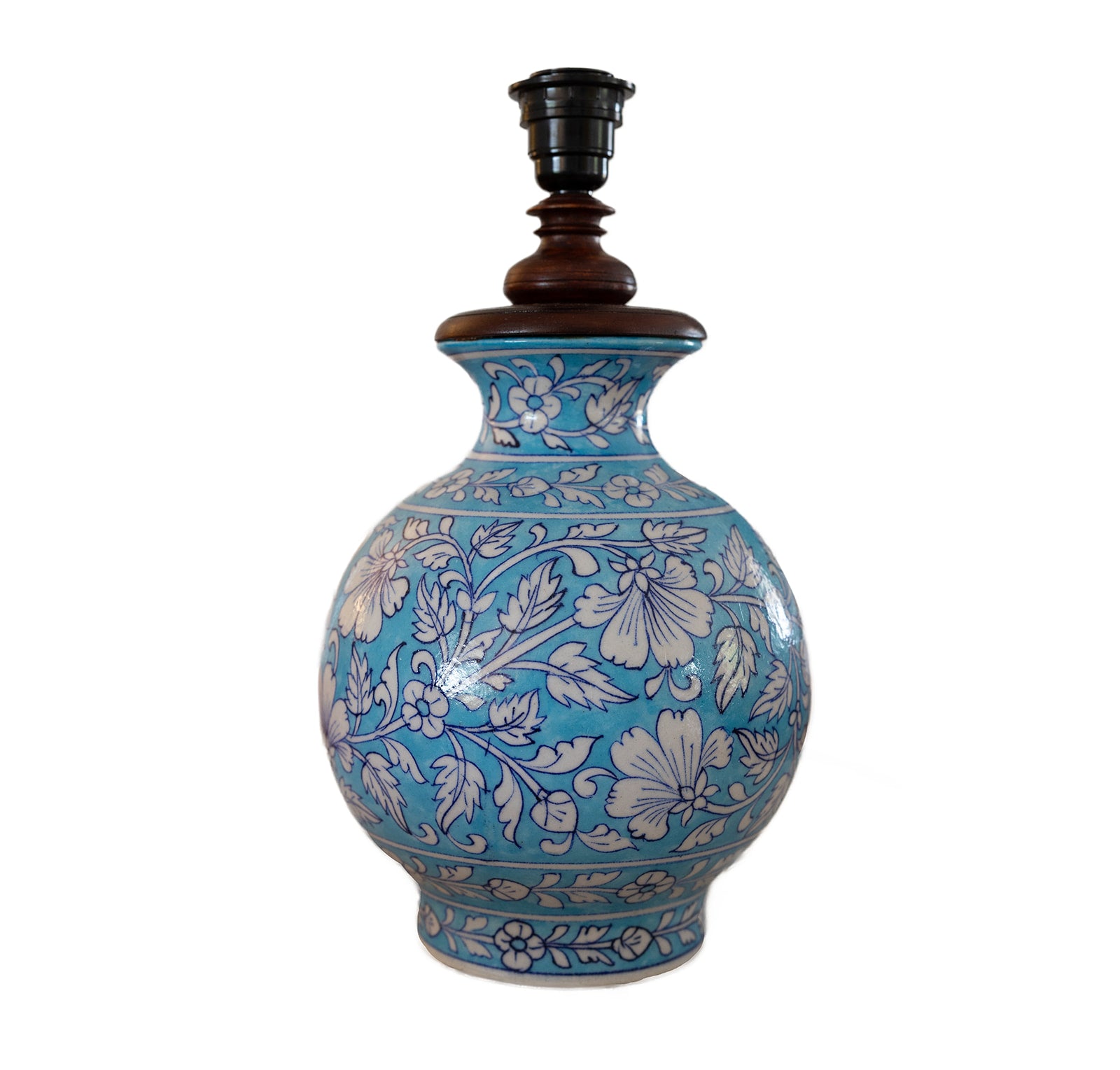 The classic Matka (water pot) form is reimagined in hand-painted blue pottery, resting on a natural timber base for a refined, contemporary touch. Subtle variations in pattern and glaze reflect the maker’s hand, ensuring every lamp is one of a kind.