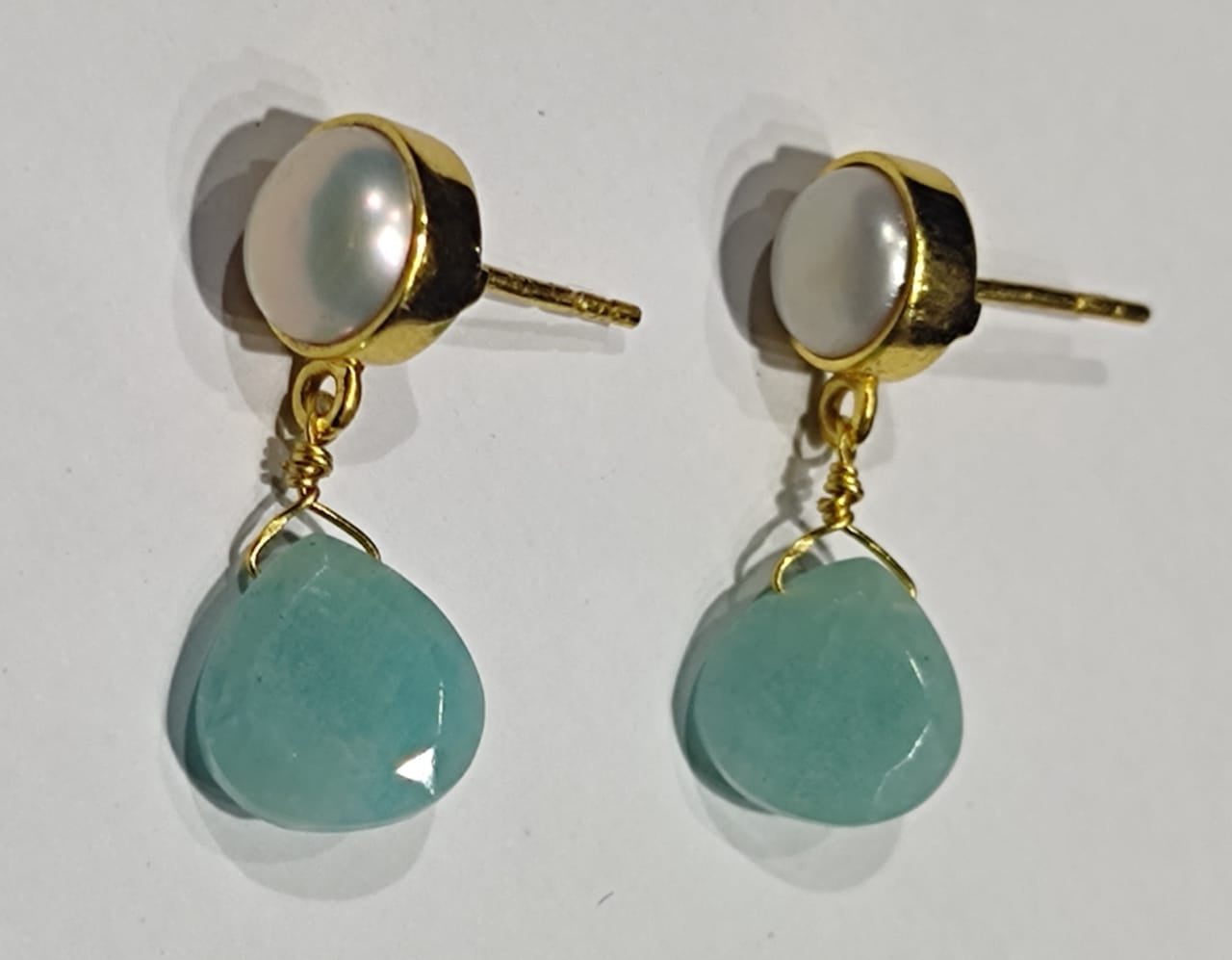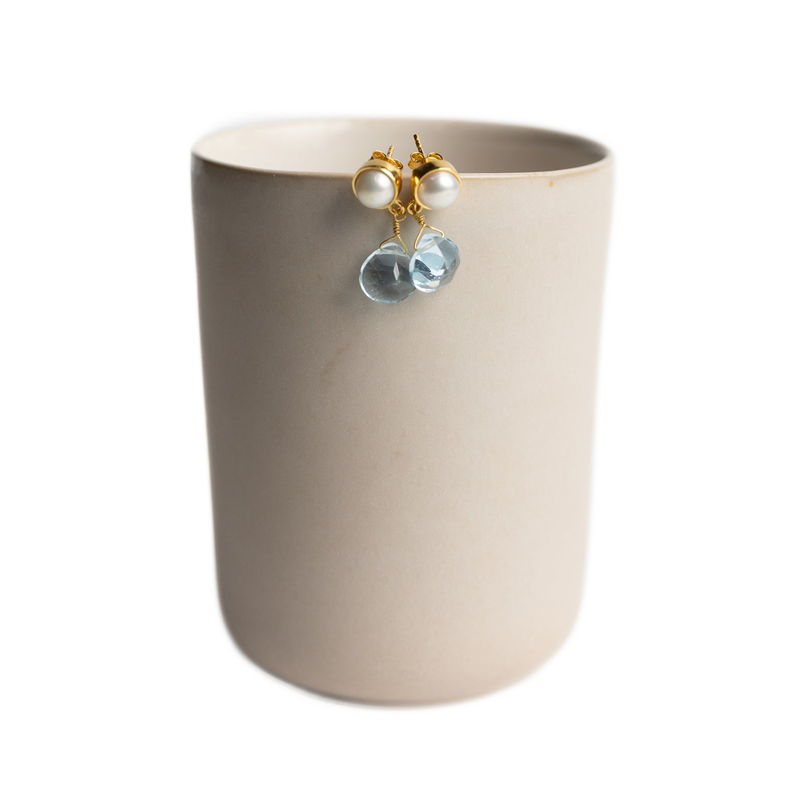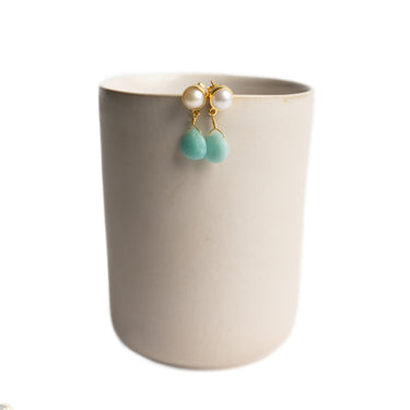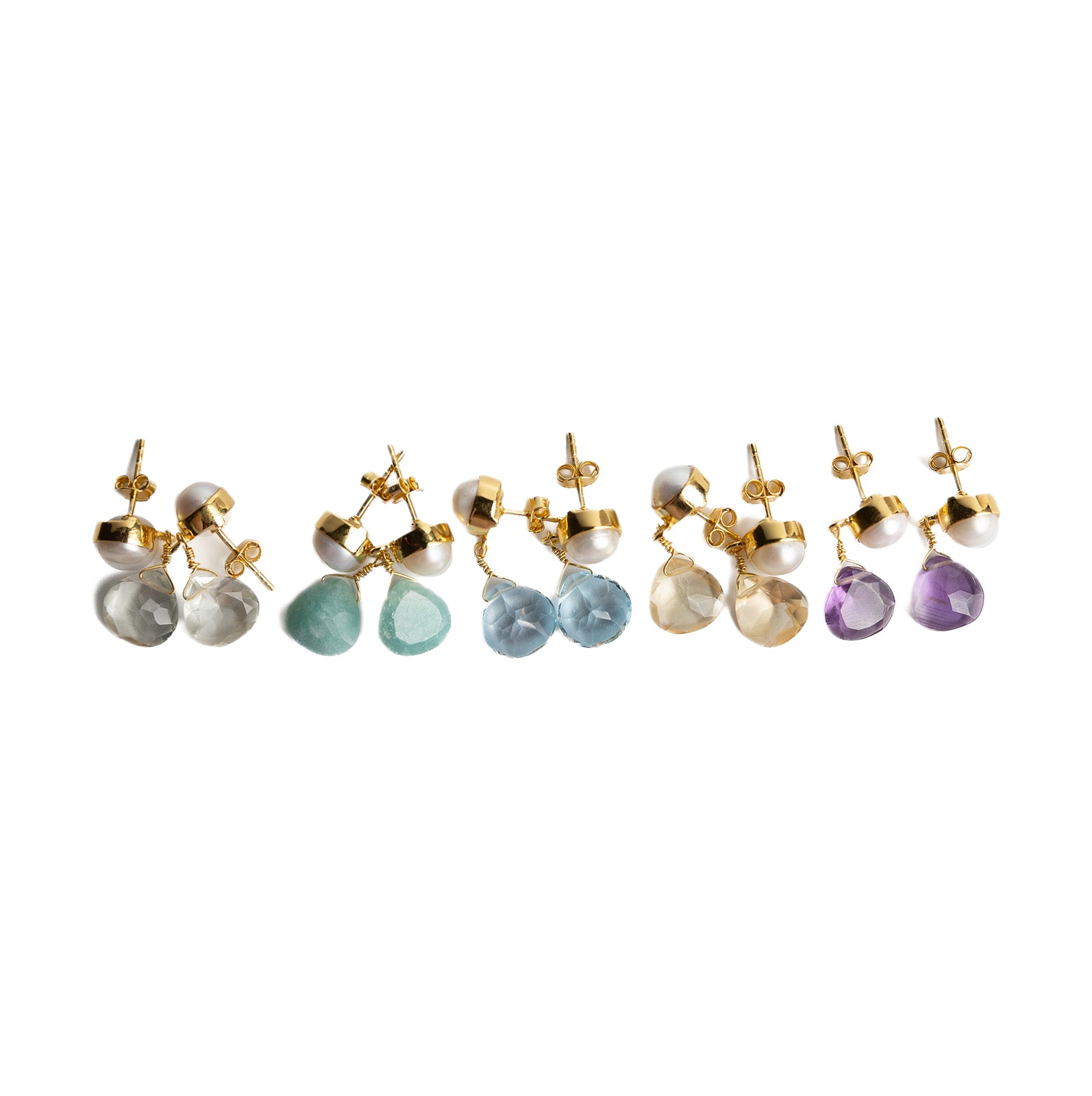 Handcrafted in Jaipur, India, these bezel-set pearl stud earrings are finished with a delicate drop of facetted semi-precious stone, creating a refined balance of classic and contemporary design. The luminous pearl sits neatly at the ear, while the natural stone drop adds soft colour and gentle movement.