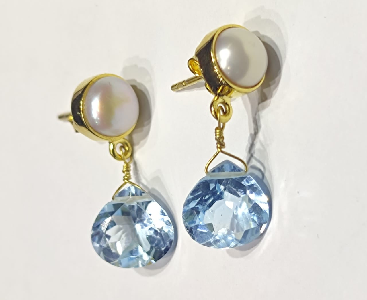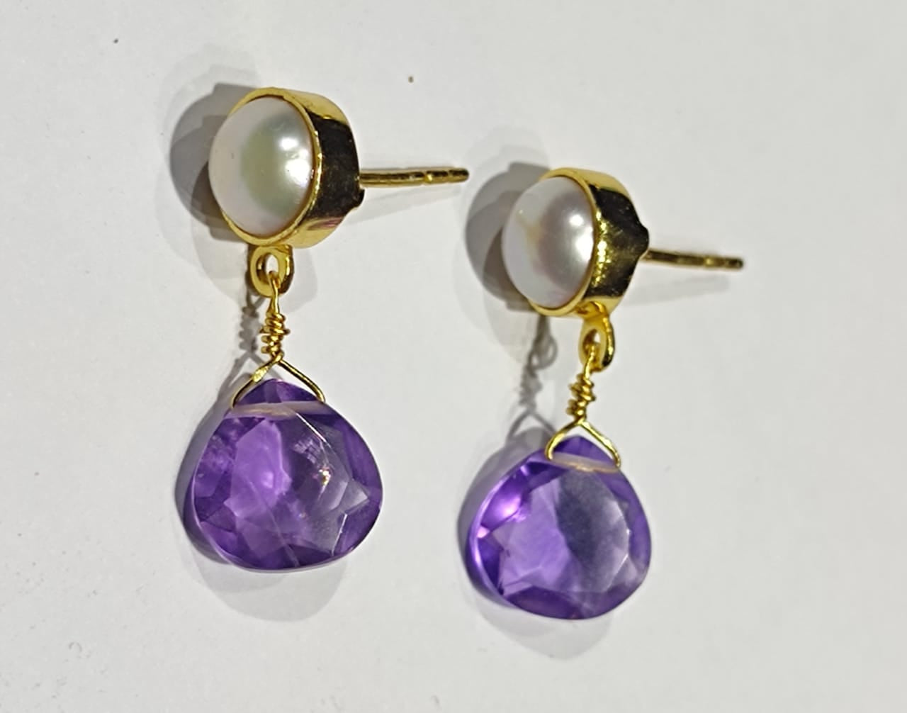 Bezel-set pearl stud with facetted semi-precious stone drop