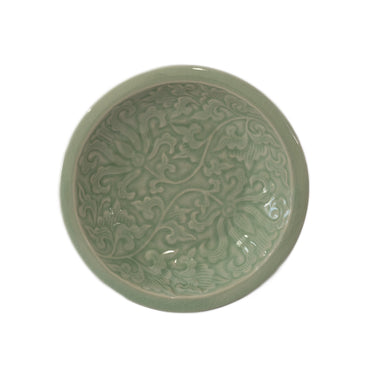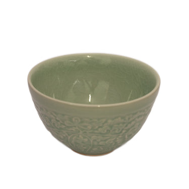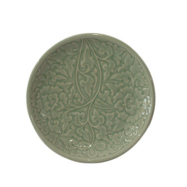 Crafted by skilled artisans in Thailand, this embossed dinnerware and serving collection is finished with a traditional celadon wood ash glaze, celebrated for its luminous depth and subtle variations in tone. Each piece is hand-thrown and kiln-fired, resulting in unique crackle patterns and soft, translucent hues that make every item one of a kind.