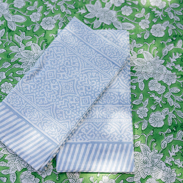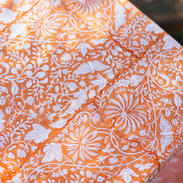 Intricately handcrafted teak blocks are used to print these lovely patterns onto the fabric. The wood blocks are carefully dipped in trays of indigo or pigment dye and pressed onto the fabric, moving from left to right. Many blocks are used to make the intricate patterns you see on our quilts, tablecloths, runners, cushions and rugs, with each colour requiring a different block. A high level of skill is required to produce a printed fabric such as this.