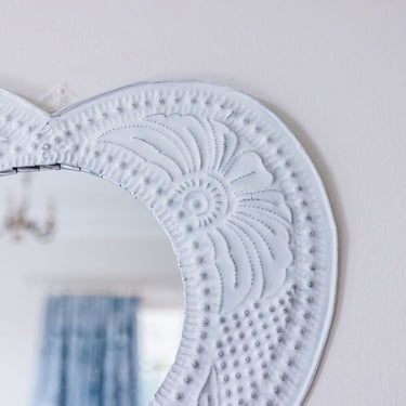 Who wouldn't love one of these pressed mirrors hanging in their bathroom?  And what young girl's bedroom wouldn't immediately look so much prettier with one of our pressed metal heart mirrors hanging on the wall? Or what about a story of mirrors, in all shapes and sizes, one colour only or a mix of white, silver & black - or pink and blue?  The possibilities are endless...