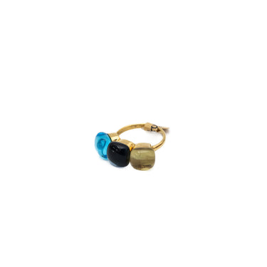 Three stunning gemstones set side by side make the most beautiful ring! A unique setting technique uses the stunning iridescence of a Mother of Pearl base to set off beautifully cut natural semi-precious gemstones, resulting in a gorgeously dreamy statement piece.