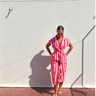 In Briony, from Bundu Textile's words:Pink and Red Wide Stripe Block Print 01 Cotton Kaftan