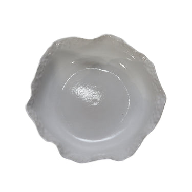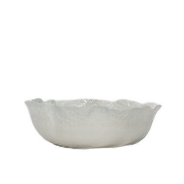 Handmade in Java, Indonesia, these white ceramic bowls feature an irregular, slightly ruffled shape, making each piece unique. Available in two sizes, these versatile bowls are wonderful for serving food or holding fruit.