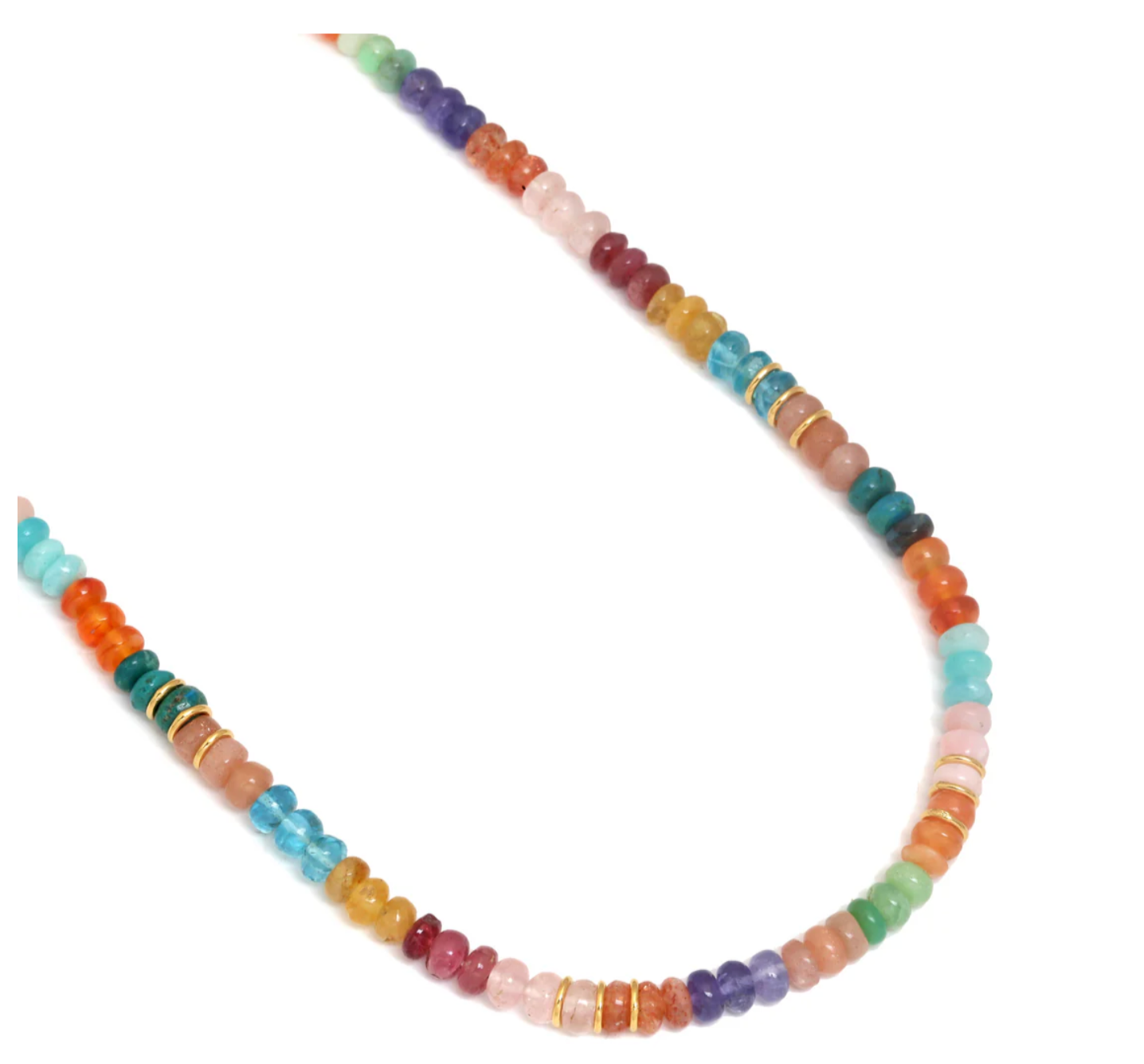 Imagine wearing a necklace that sparkles with all the colours of the rainbow! It's like carrying a piece of happiness around your neck. Each colour represents something special, like red for love, orange for energy, yellow for sunshine, green for nature, blue for calmness, indigo for intuition, and violet for imagination. When you wear a rainbow necklace, you're wearing a little bit of everything wonderful in the world. It's a reminder to embrace diversity, spread joy, and celebrate life's vibrant spectrum. So, let your necklace shine bright, just like you!