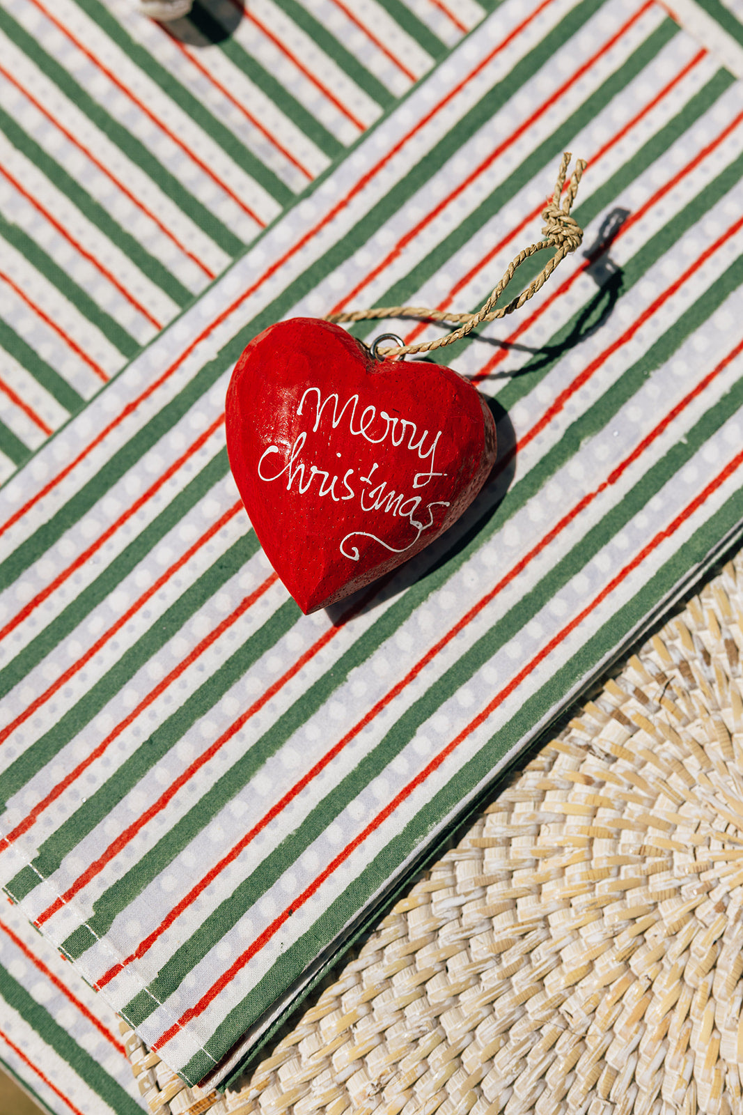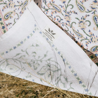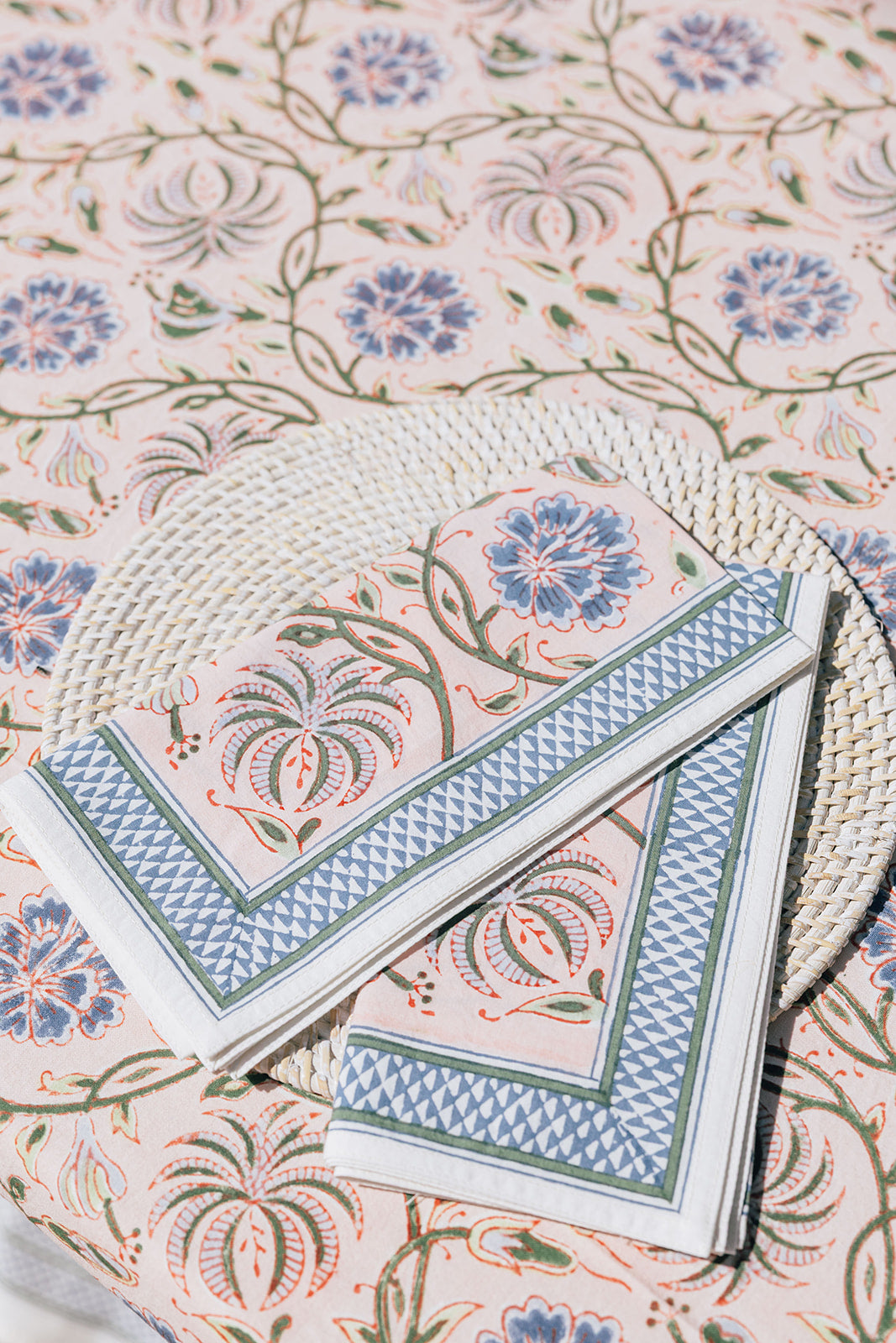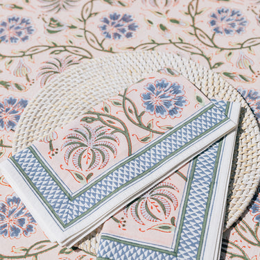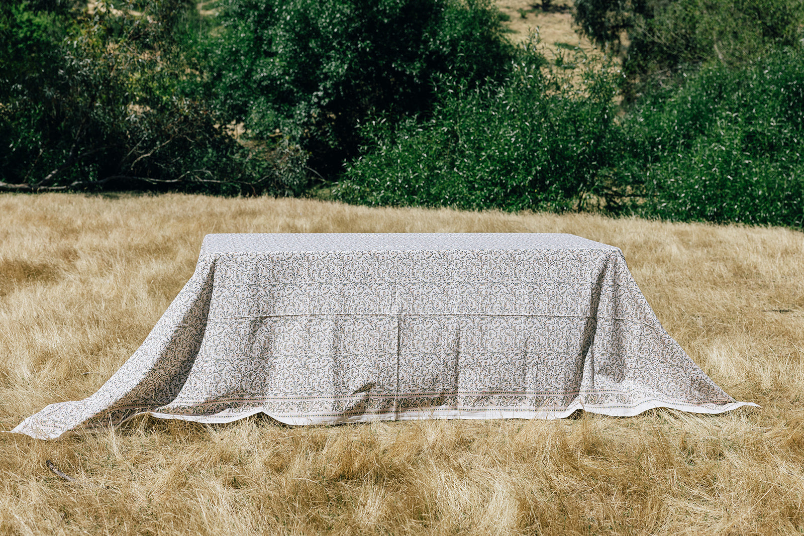 Everything in the process of making these tablecloths is done in-house. From the design of the patterns and the intricate carving of the teak blocks and the mixing of the dyes and the block printing, to the sewing of hems, right down to the packing and wrapping of our order: worker job satisfaction, the environment and quality control take the front seat.