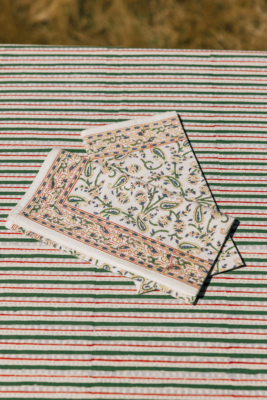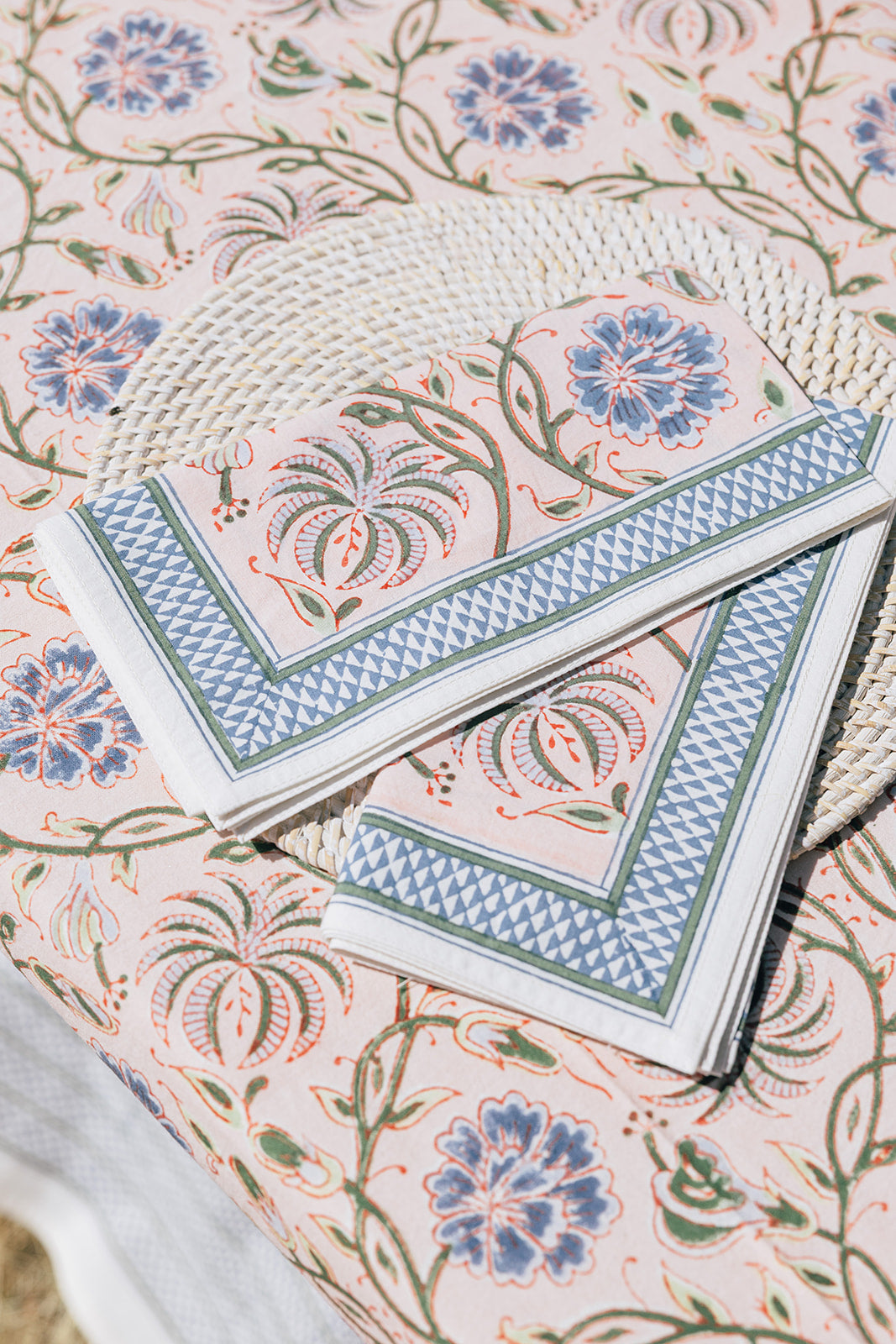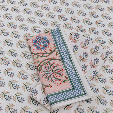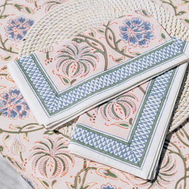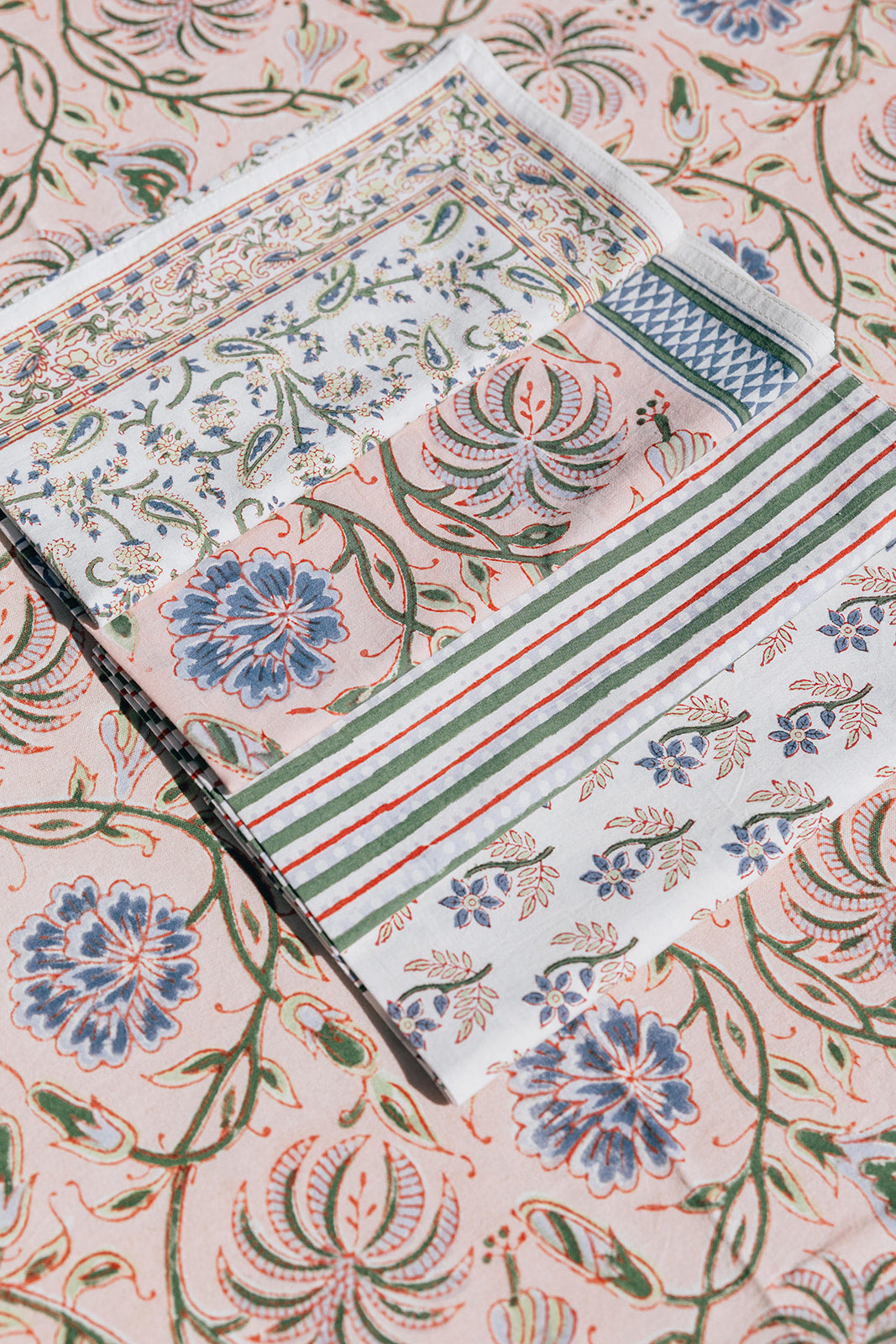 Bring colour, craft, and tradition to your table with our multicolour range of hand block printed cotton napkins, created exclusively for Merchant Campbell in Jaipur, India. Each napkin is printed by hand using generations-old techniques, where carved wooden blocks are dipped in natural dyes and pressed onto the cloth to create intricate, lively designs.