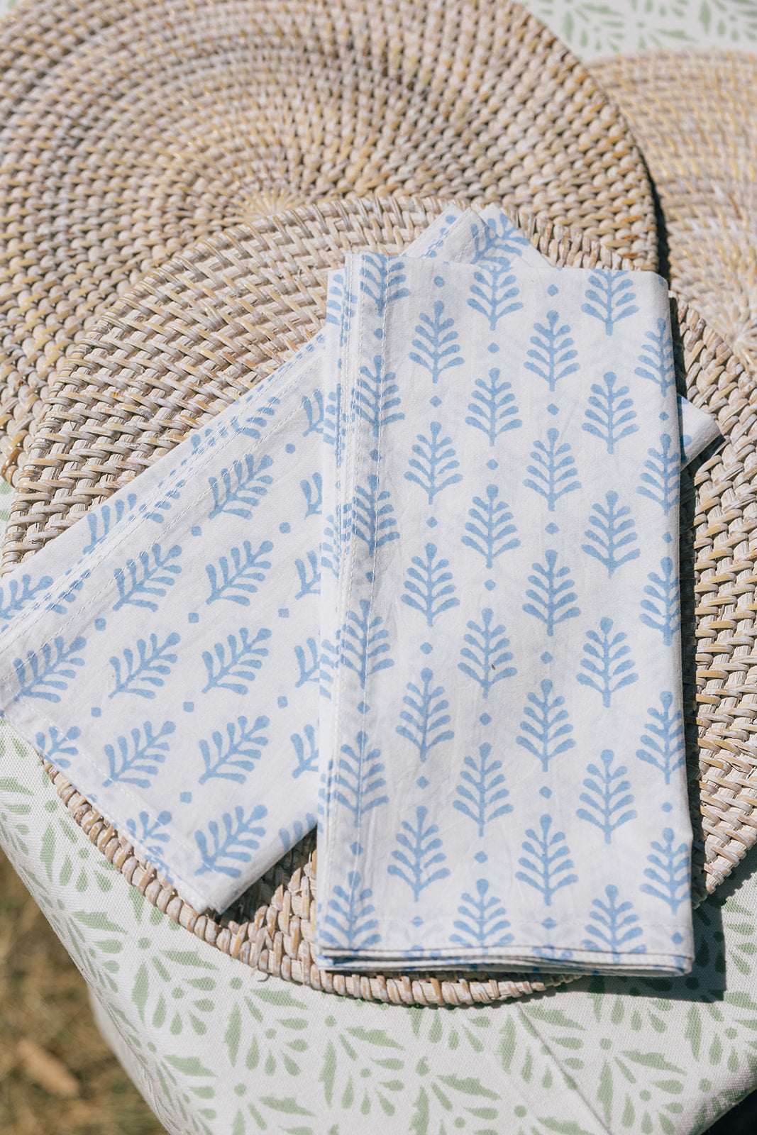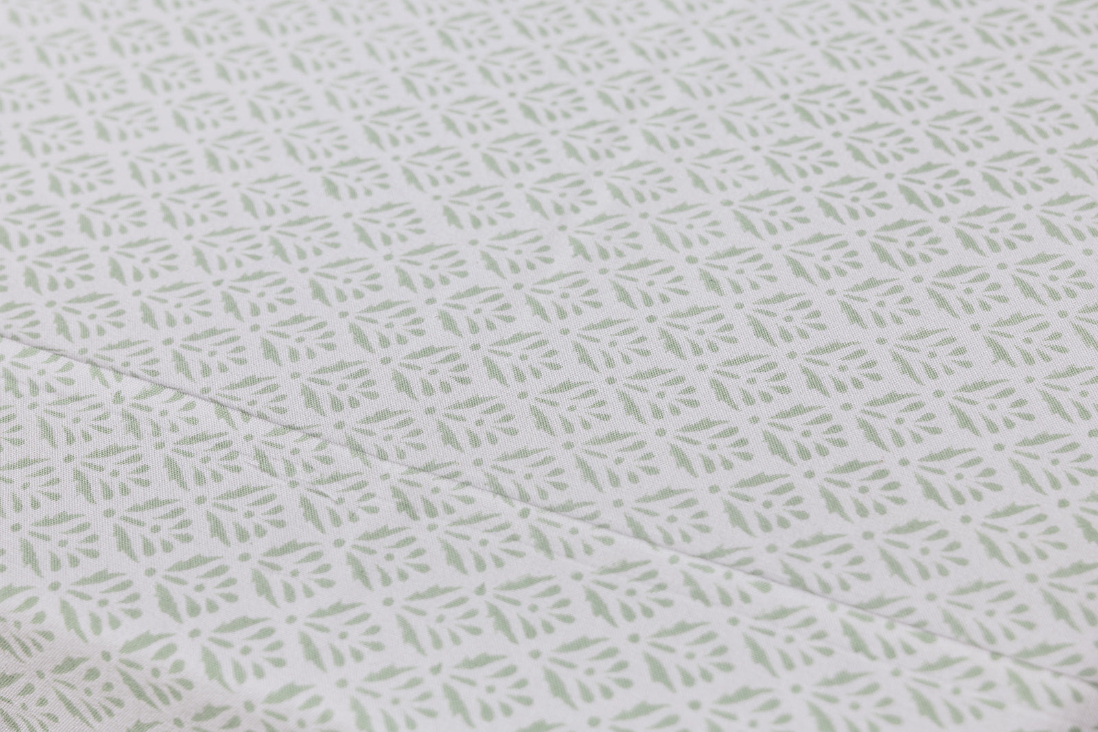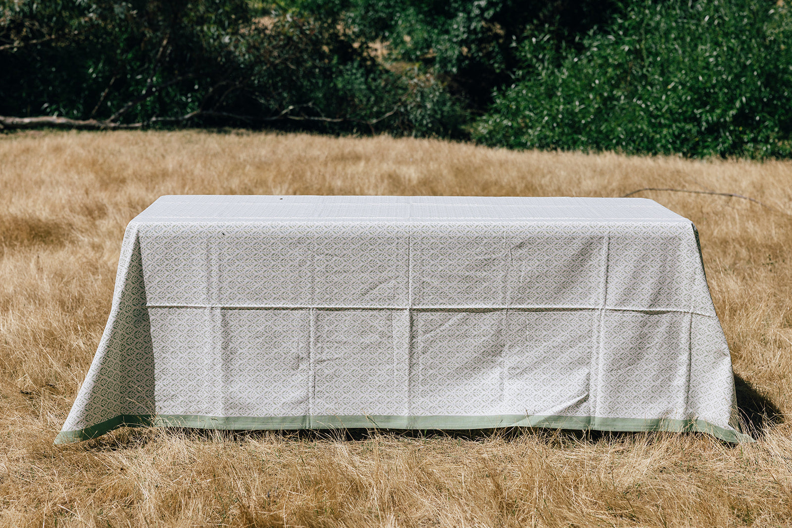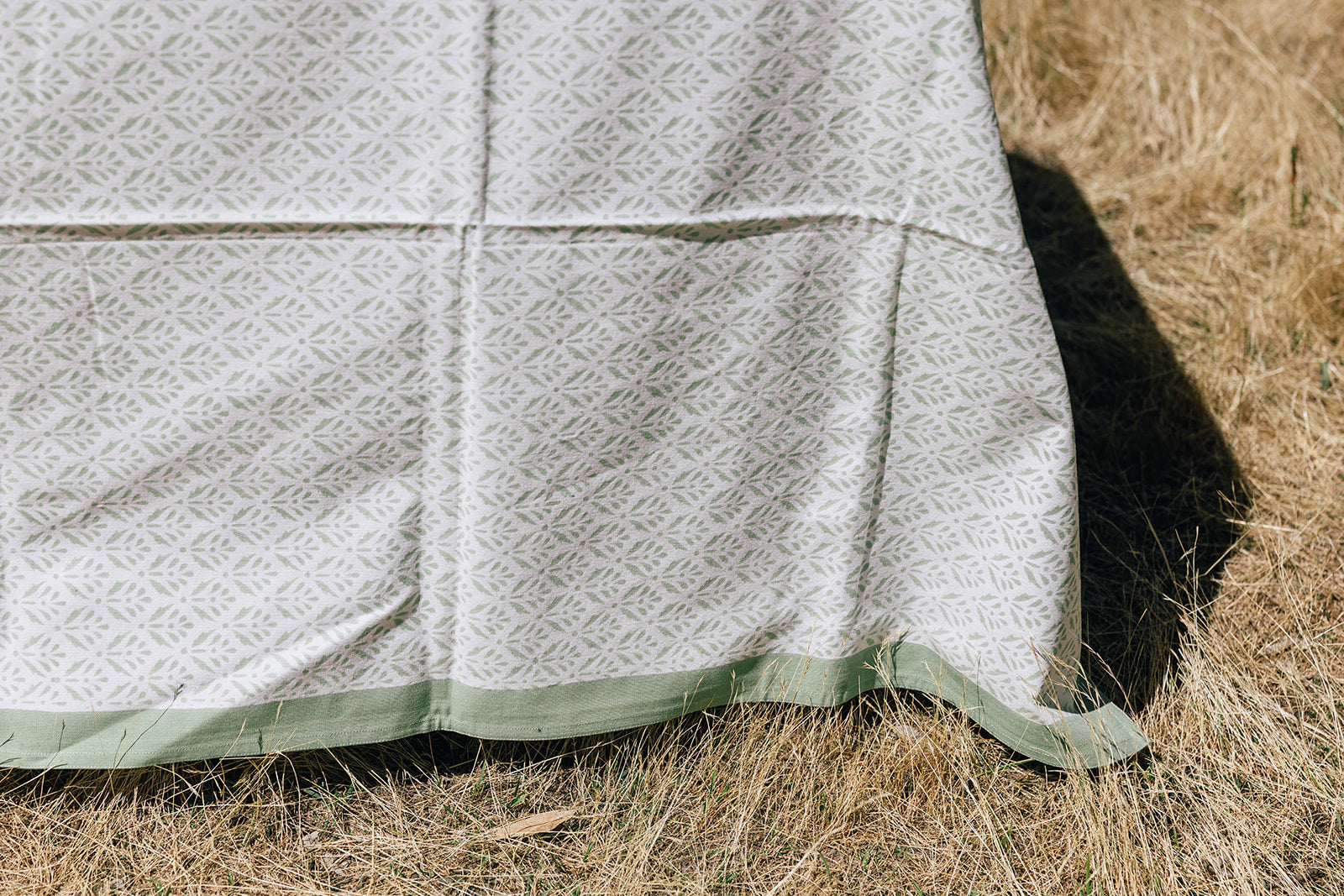 Pretty soft green, hand block printed tablecloth in sturdy duck cotton. Versatile for year round use.