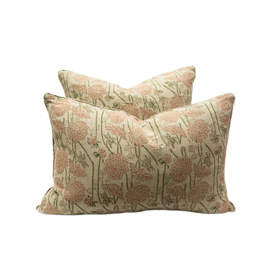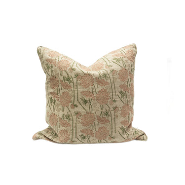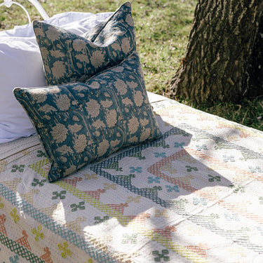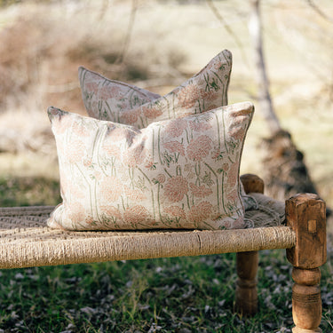 Pretty floral block printed linen cushion covers hand made for Merchant Campbell. These look beautiful on a sofa, your bed, or one of our showstopper charpai benches!