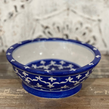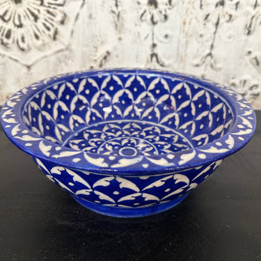 A beautiful bowl of a pleasing shape in rich shades of either blue or green. Painted by hand in a design reflecting the strong Moorish influences of northern India.