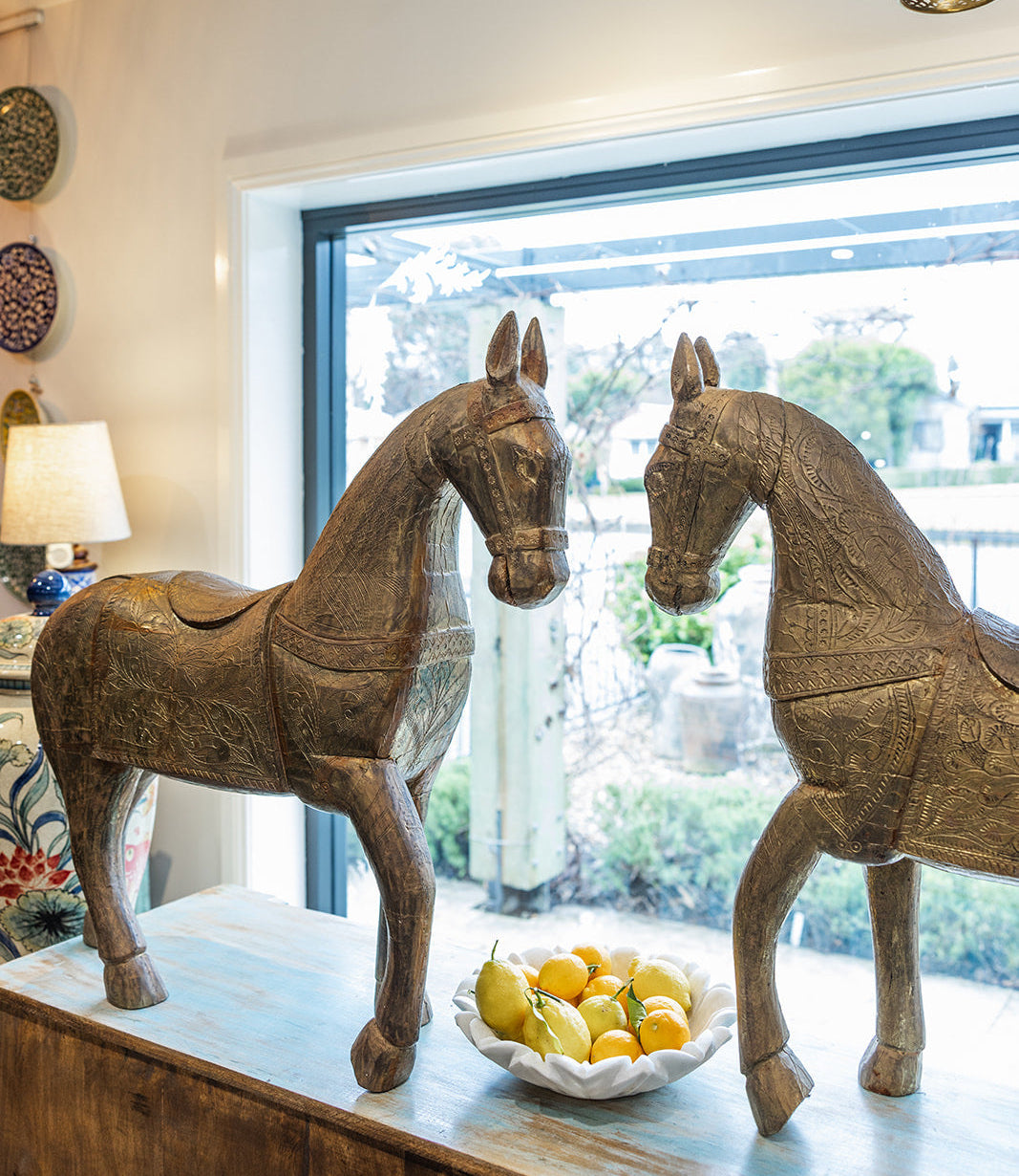 In Rajasthani culture the horse symbolises honour, protection and nobility, long associated with warriors and guardianship. Placed at entrances and shrines, horse figures were believed to watch over a space and bring strength and safe passage to those within. Even today they remain an auspicious motif, representing courage, loyalty and status.
