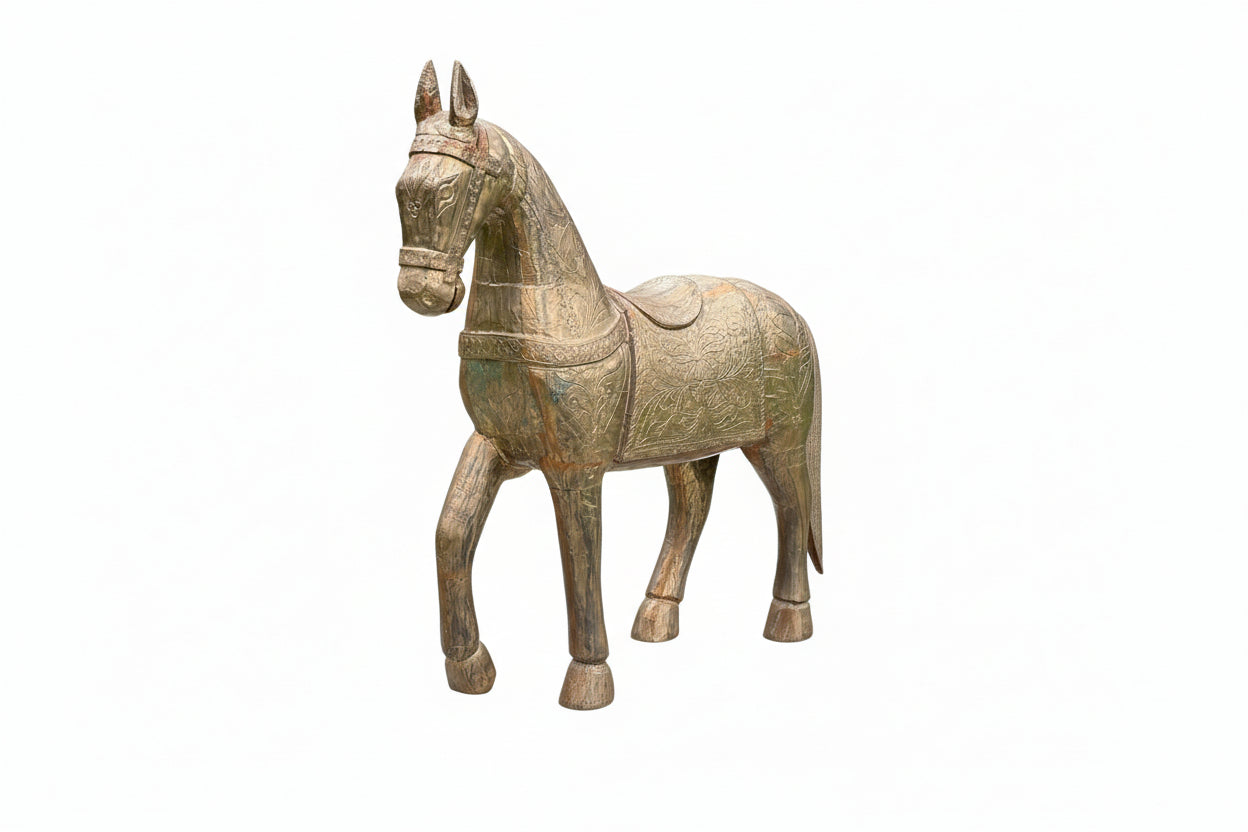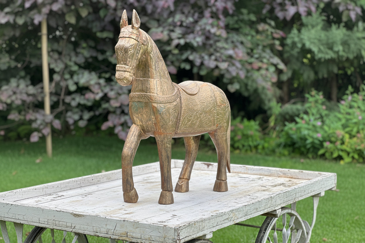 Hand carved in Rajasthan and finished with a traditional brass plating, this temple horse carries both decorative presence and cultural meaning. The form is proud and alert — ears forward, neck arched — reflecting the reverence held for the horse throughout Rajasthan’s history.