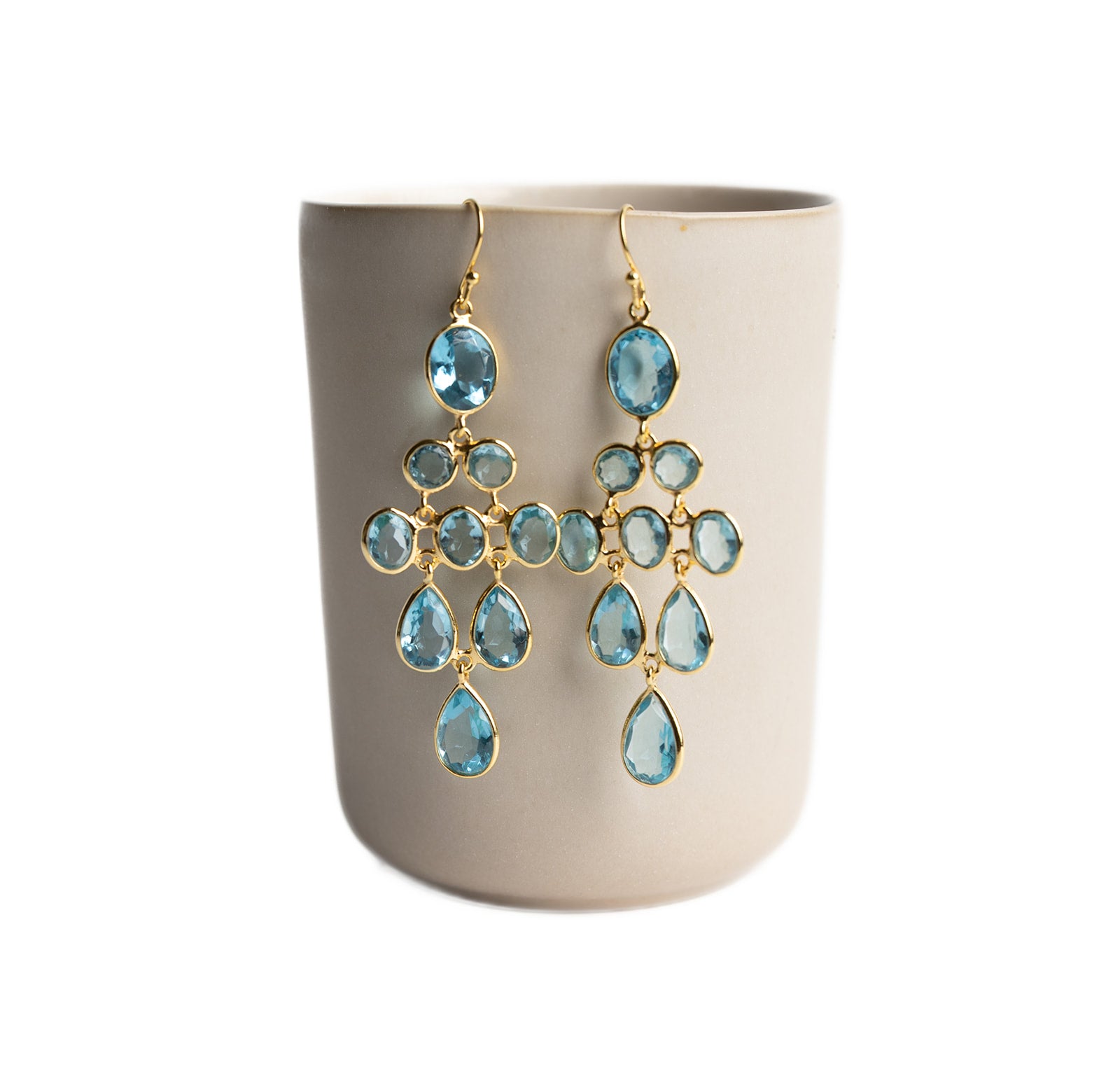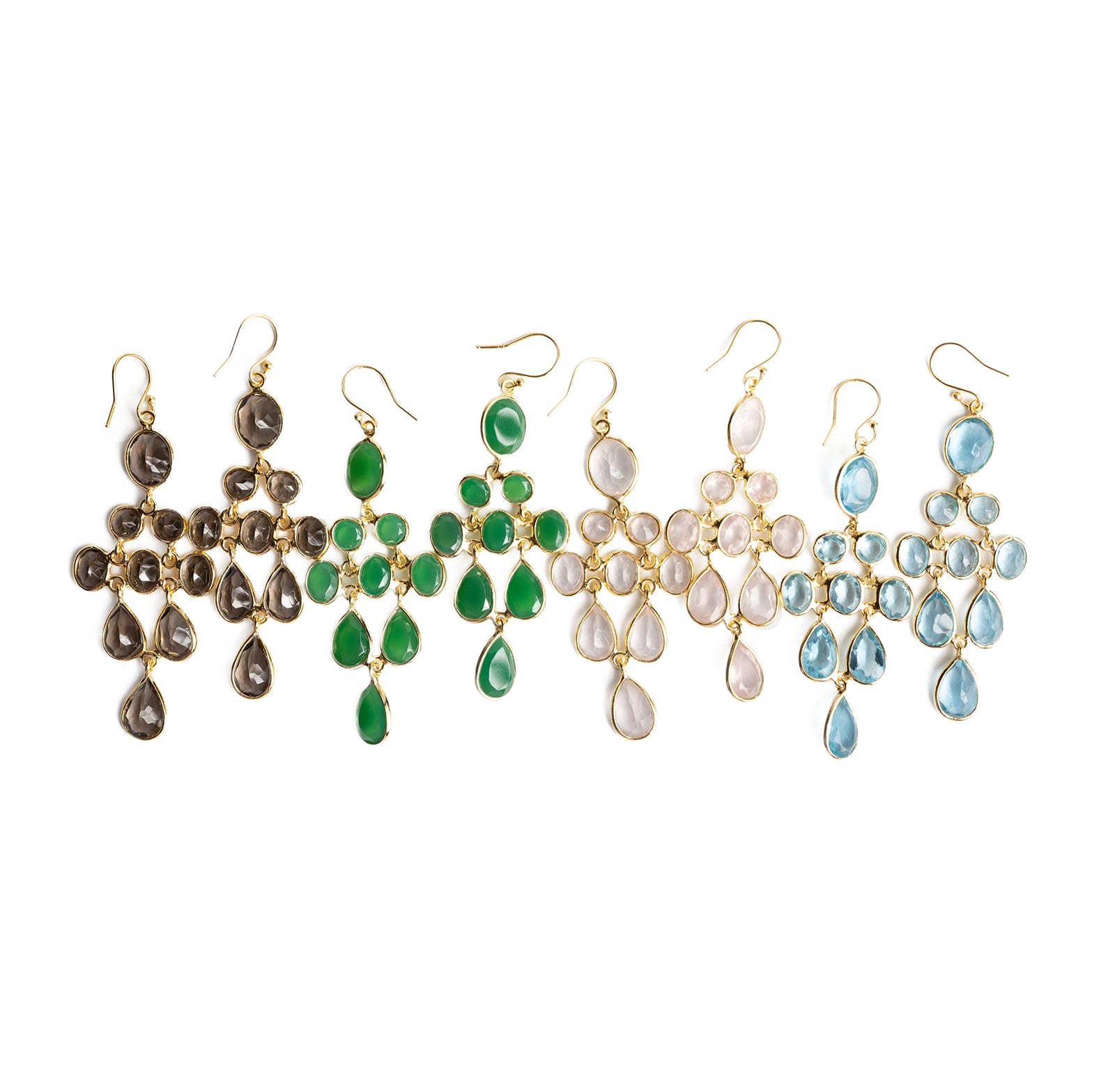 Merchant Campbell earrings,  , gold-plated silver earrings, Jaipur handmade jewellery, blue topaz earrings, rose quartz earrings, chrysoprase earrings, smoky topaz earrings, natural stone earrings, lightweight gemstone earrings, artisan jewellery India, classic gold plated earrings