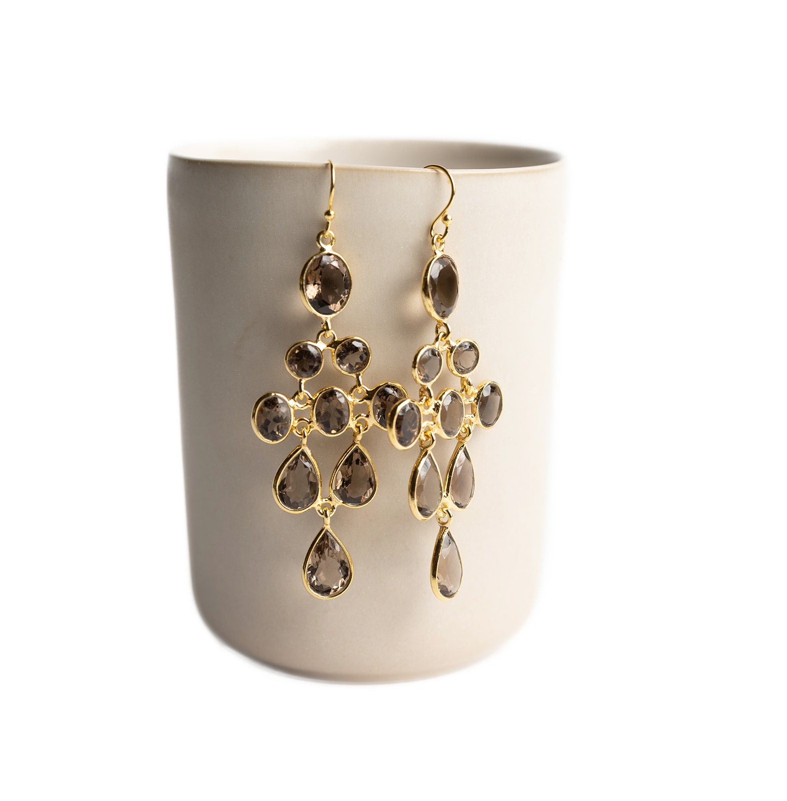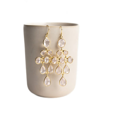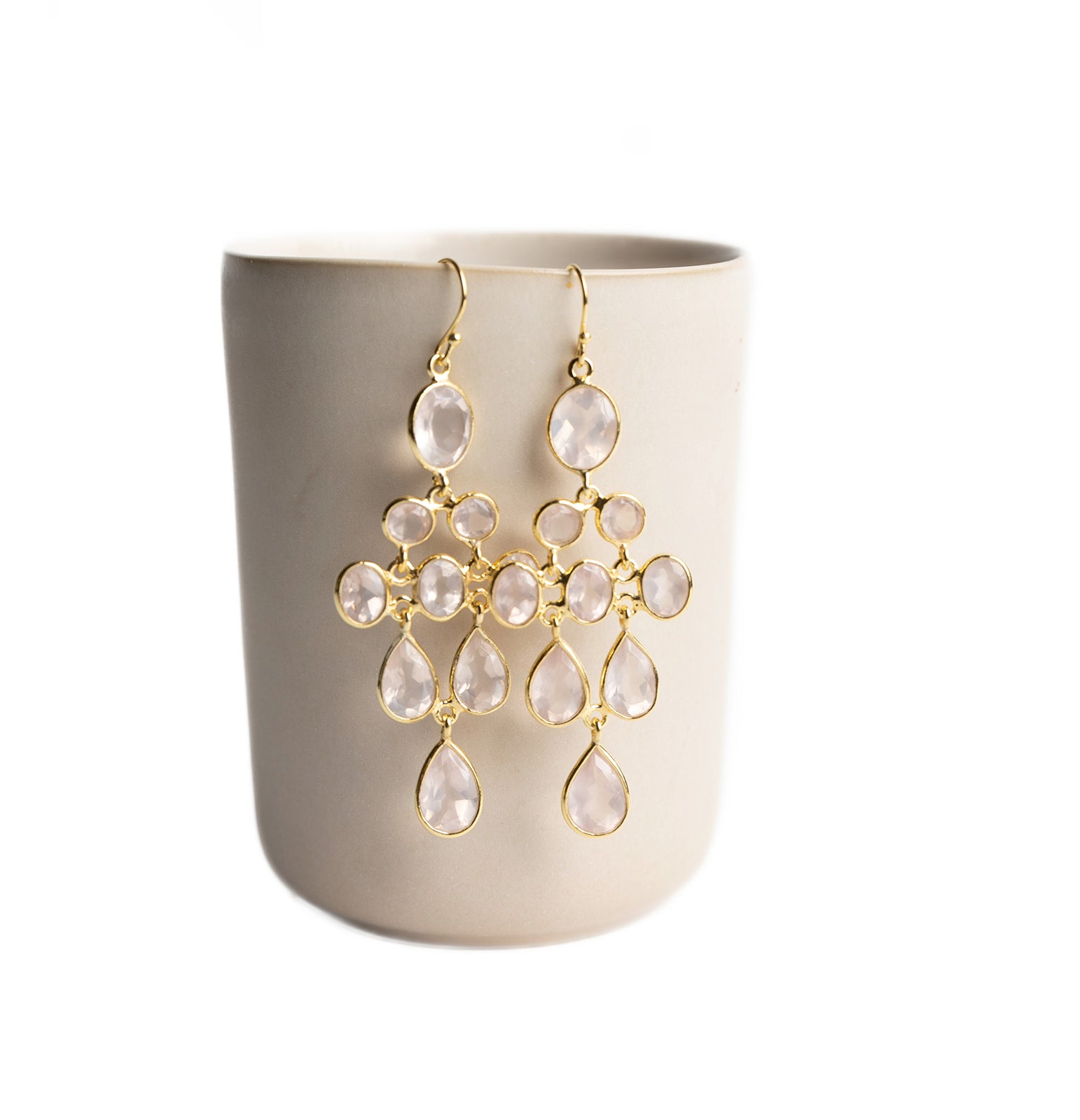 Elegant, lightweight, and beautifully refined, these micron gold-plated sterling silver chandelier earrings feature facetted teardrop-shaped semi-precious stones that catch the light with effortless sparkle. Each pair is handmade in Jaipur, a city celebrated for generations of master jewellers and some of the finest stone cutters in the world.