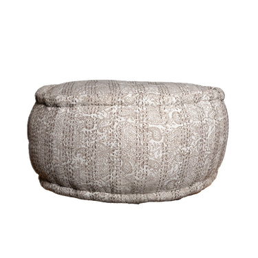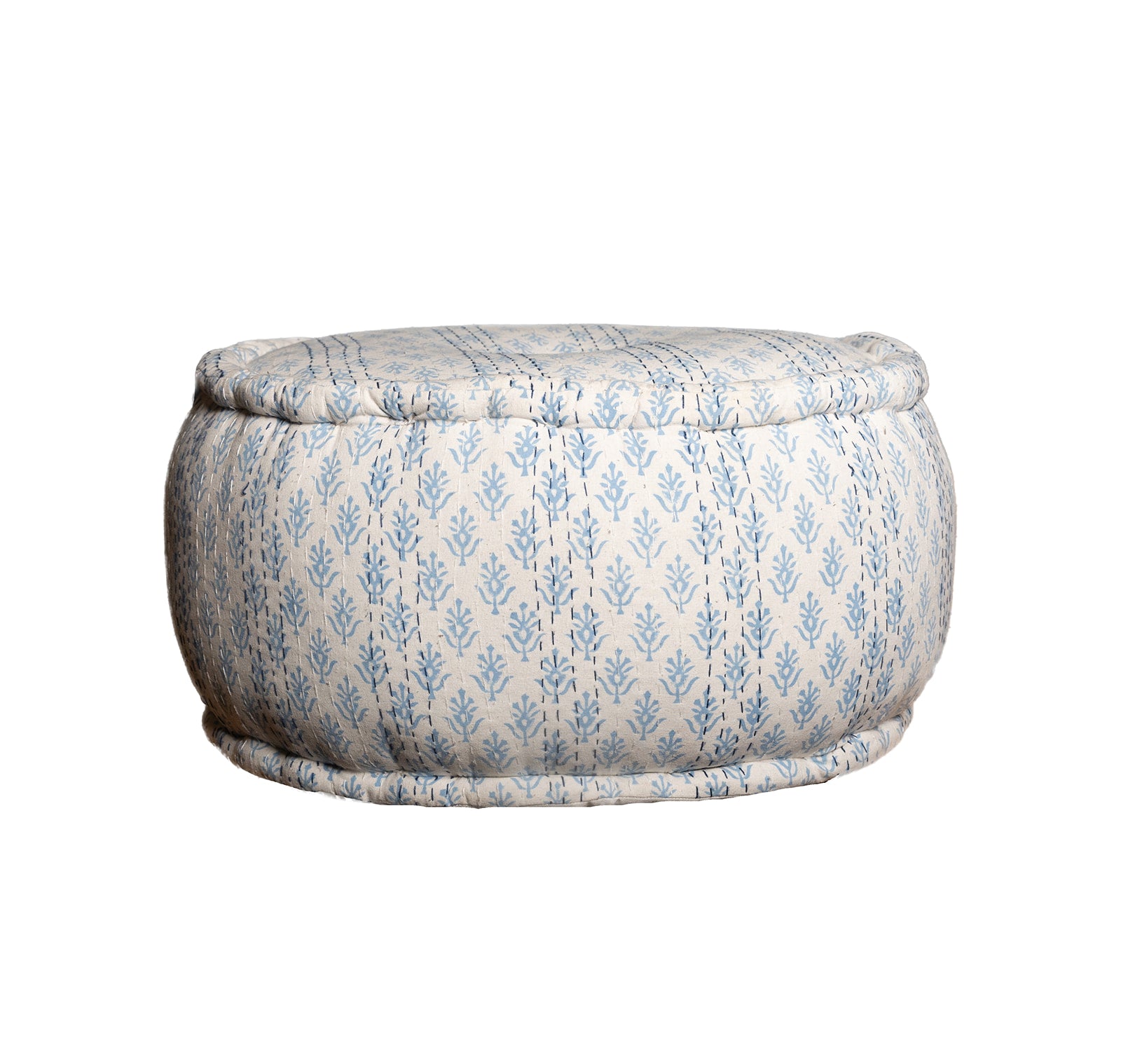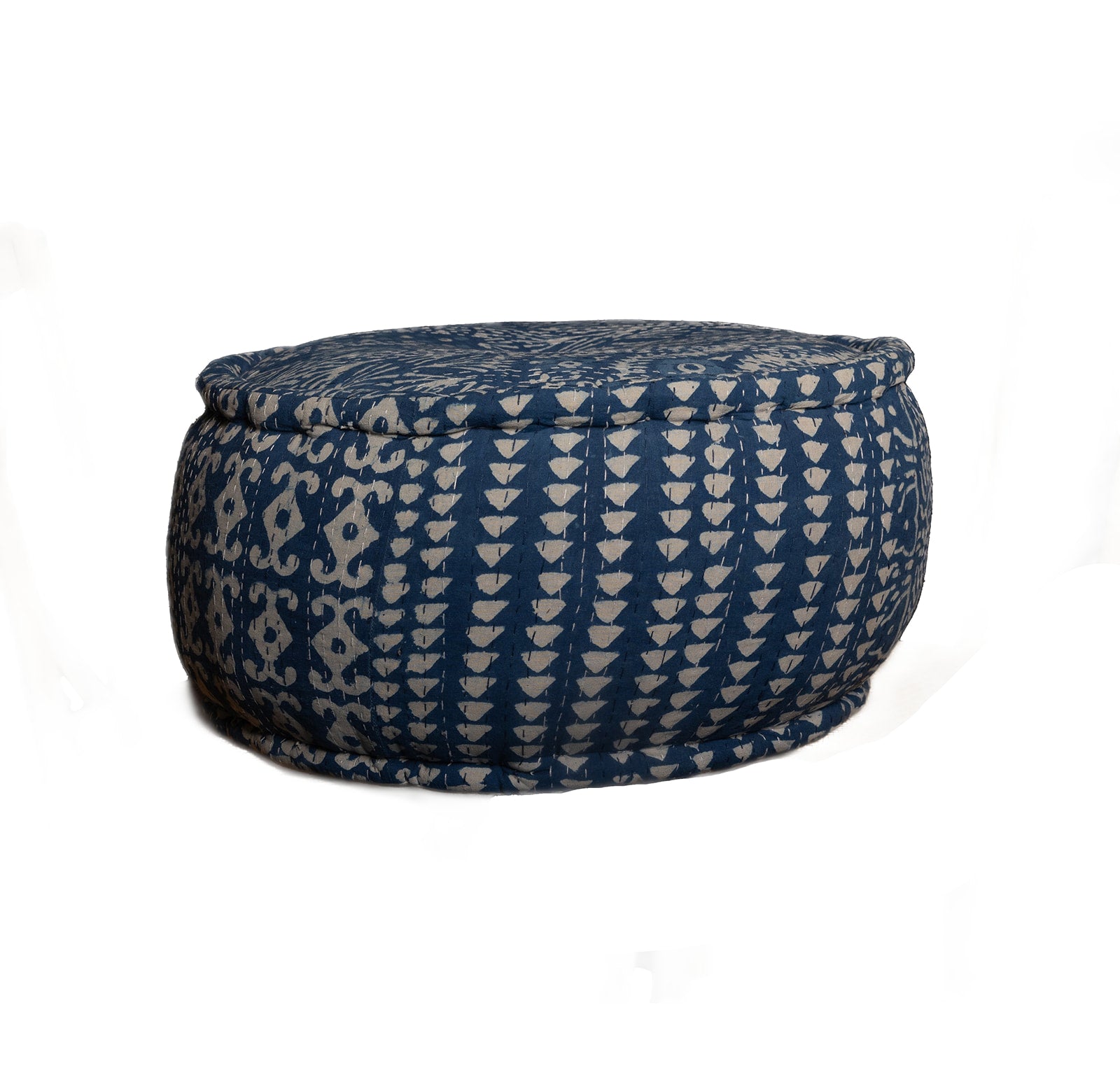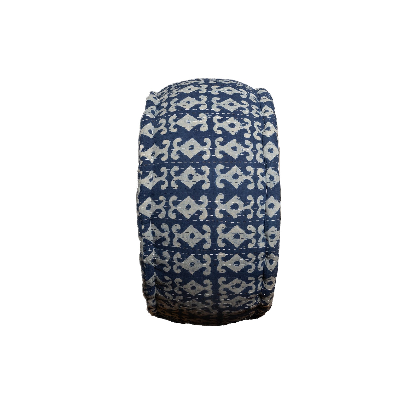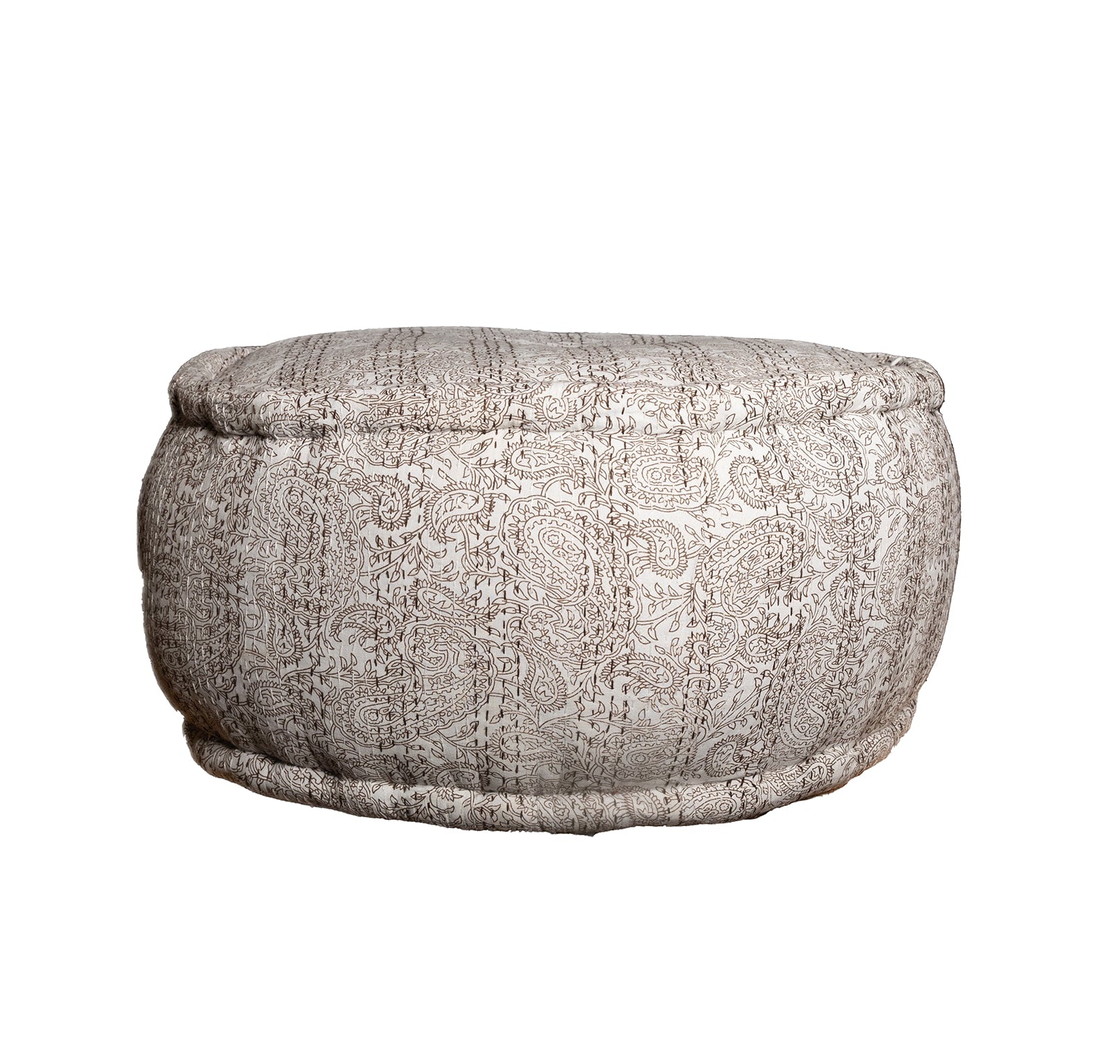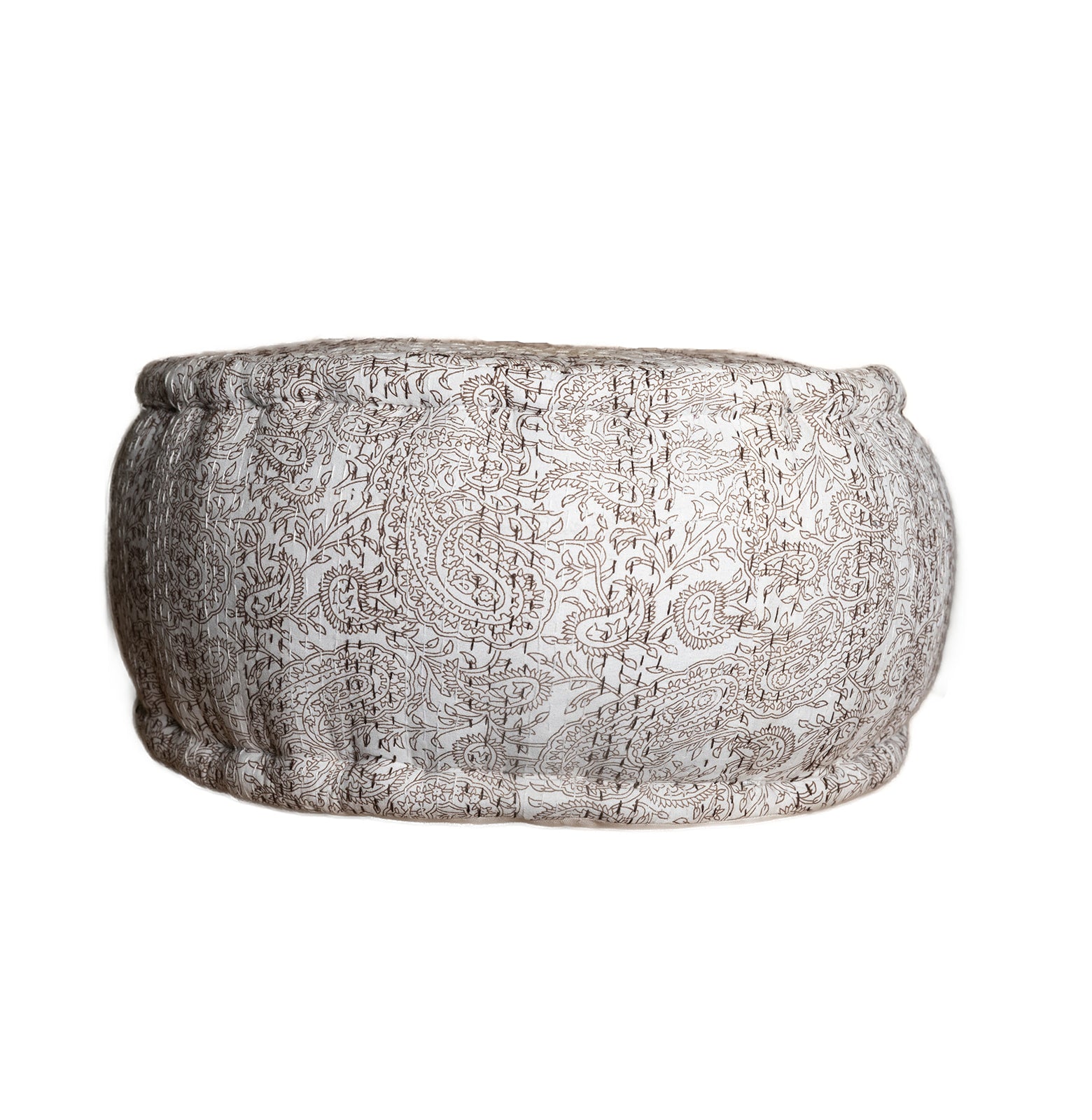 Covered in 100% cotton, screen printed or hand block printed in rich, characterful patterns, each piece is finished with beautiful kantha stitching, adding texture, detail and a subtle handcrafted charm. The gentle quilting effect enhances both durability and visual interest, giving every pouffe a warm, artisanal feel.