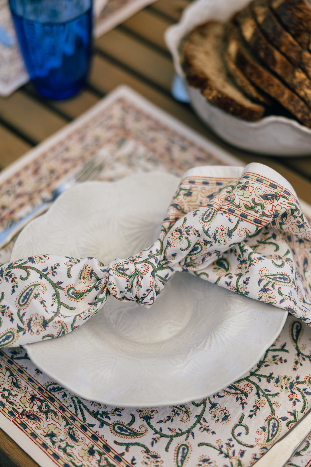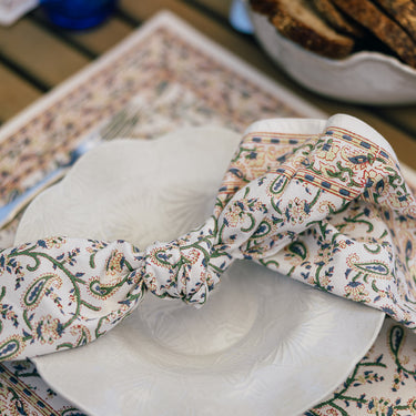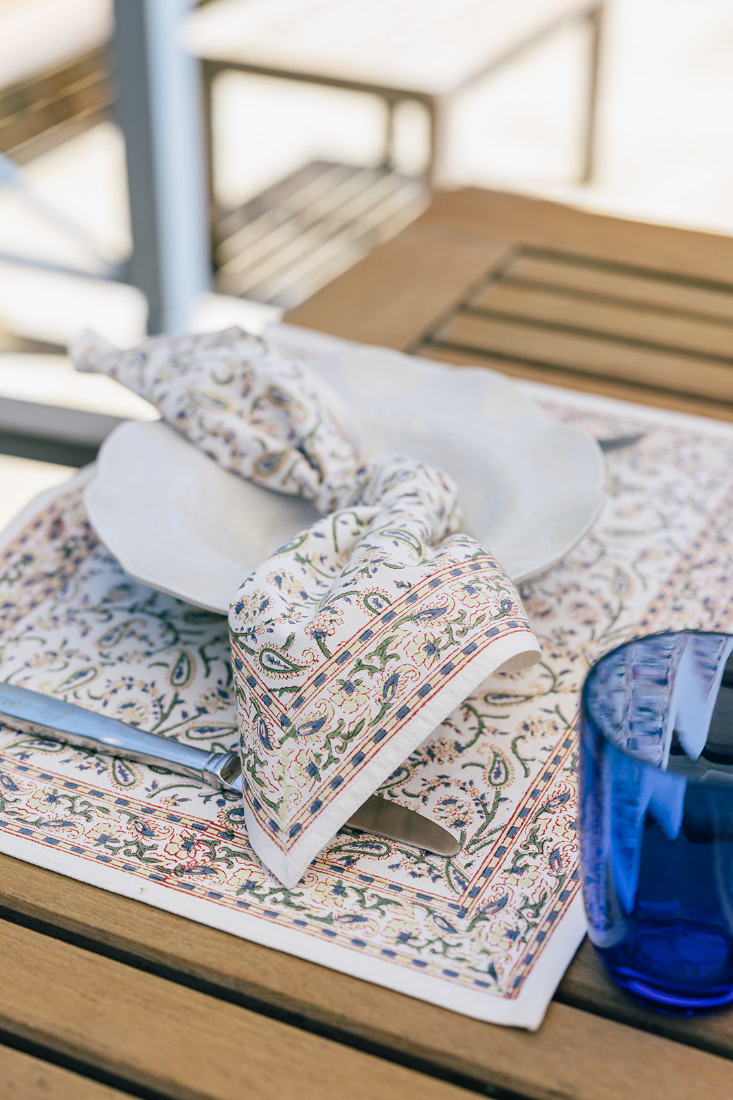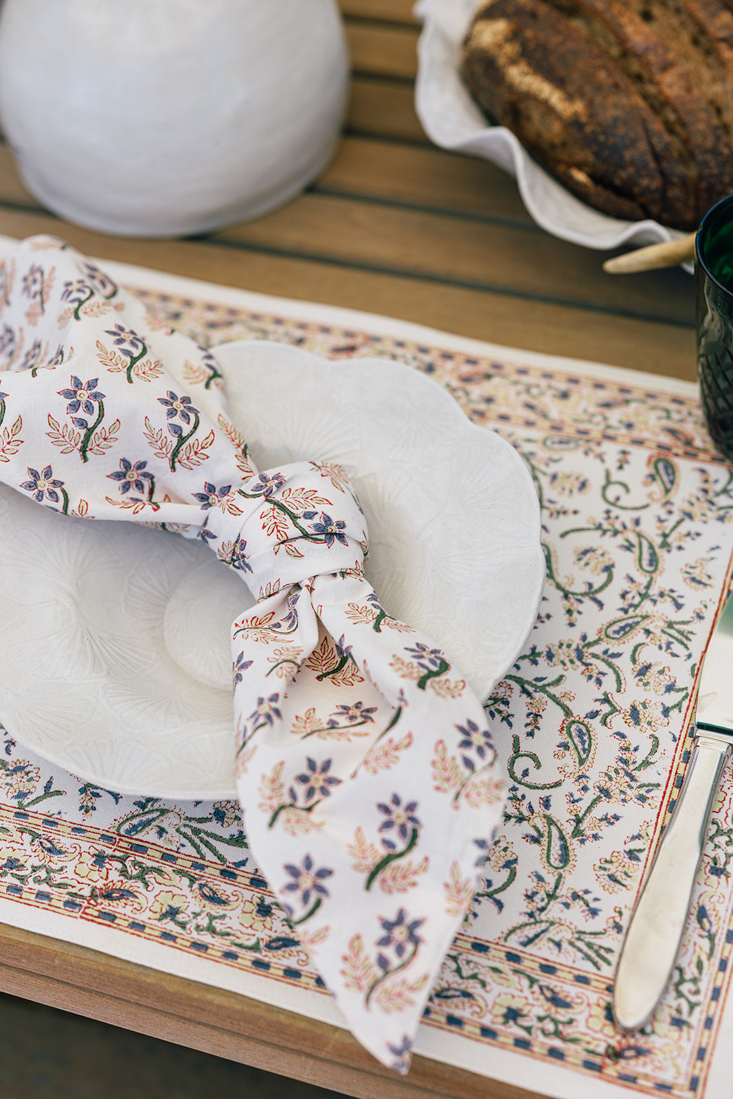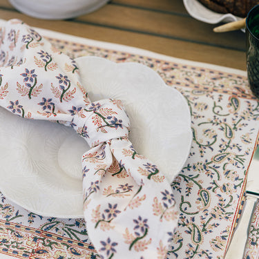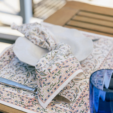 Bring colour, craft, and tradition to your table with our multicolour range of hand block printed cotton napkins, created exclusively for Merchant Campbell in Jaipur, India. Each napkin is printed by hand using generations-old techniques, where carved wooden blocks are dipped in natural dyes and pressed onto the cloth to create intricate, lively designs.