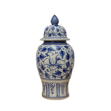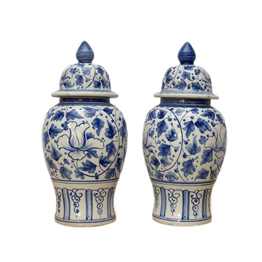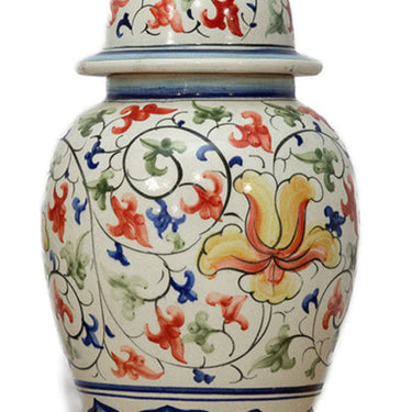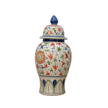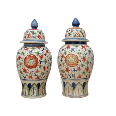 Lovely, ceramic ginger jars in beautiful colours with finial top. Hand made and hand painted in Java, Indonesia, by artisans whose Chinese heritage goes back to the days of the Spice Wars in the 1500s.