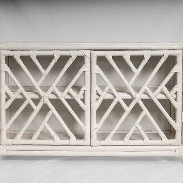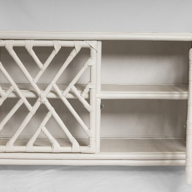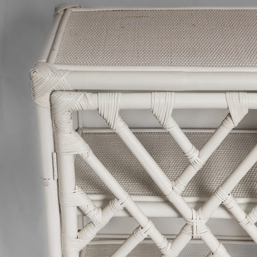Pretty white rattan sideboard with handy storage space. Slightly damaged with a bit of chipped paint, so reduced for a bargain!